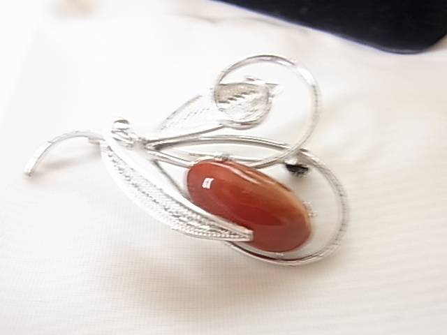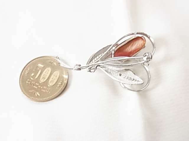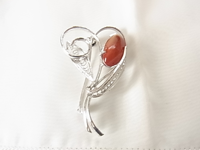 朱色 赤系のストーン調 シルバーカラーのデザイン 銀色 チューリップみたいに見えるブローチ▽