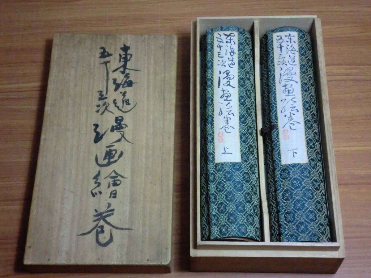180806K02★ky 肉筆 東海道五十三次 漫画絵巻 上下巻 細木原青起箱書き 東京漫画会同人18名合作 大正10年 全55図 岡本一平 服部亮英 巻物