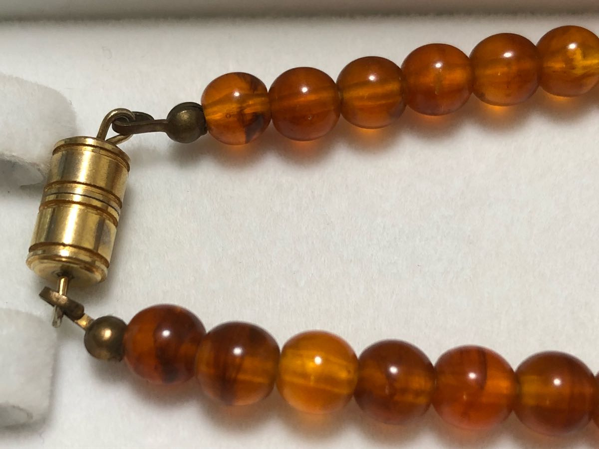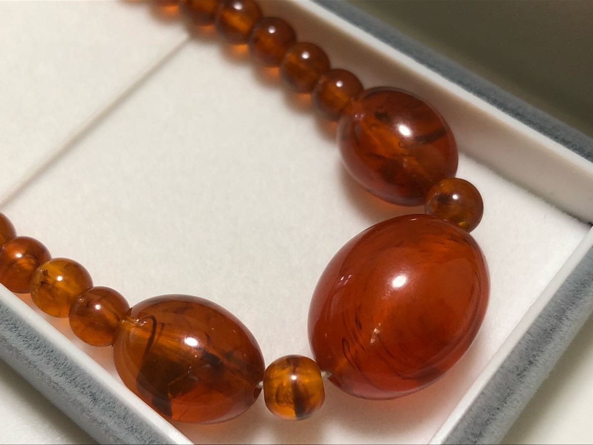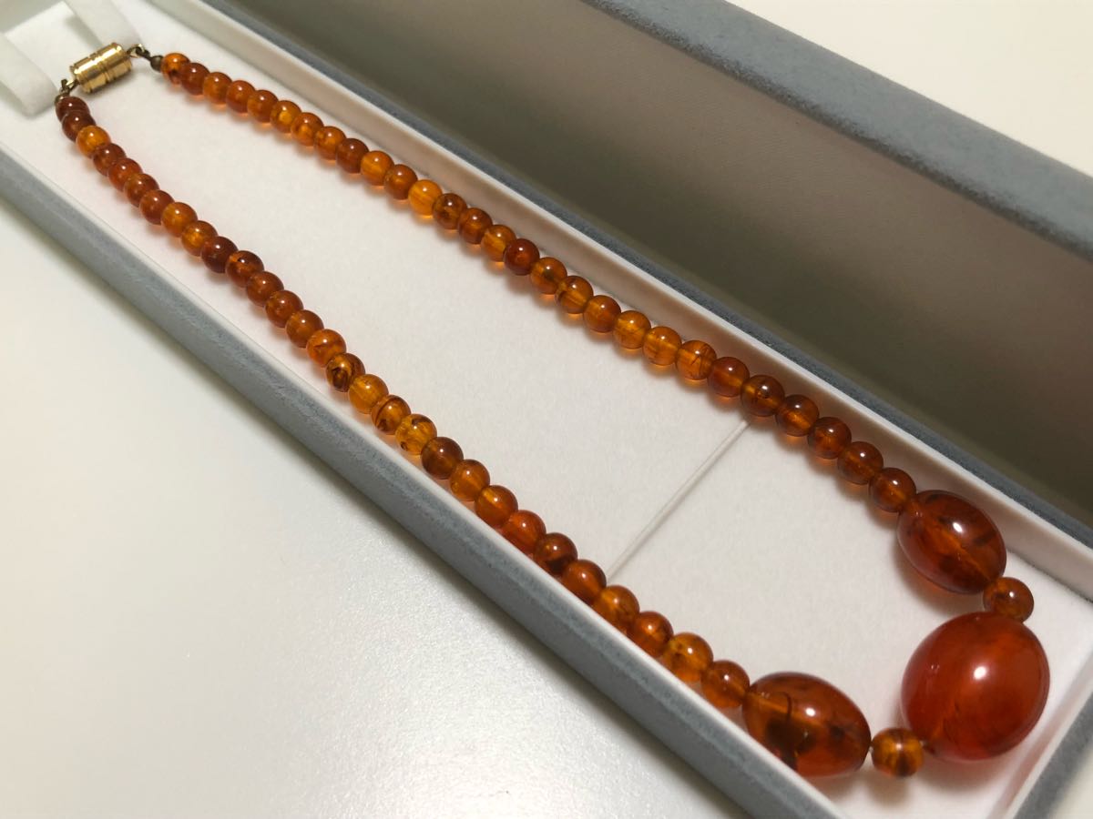 鼈甲風(樹脂)に仕上げた、オーバルデザインのネックレスです。金具部分に若干の色あせがあります。
