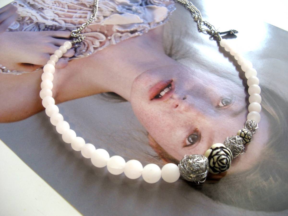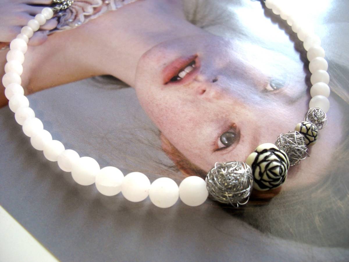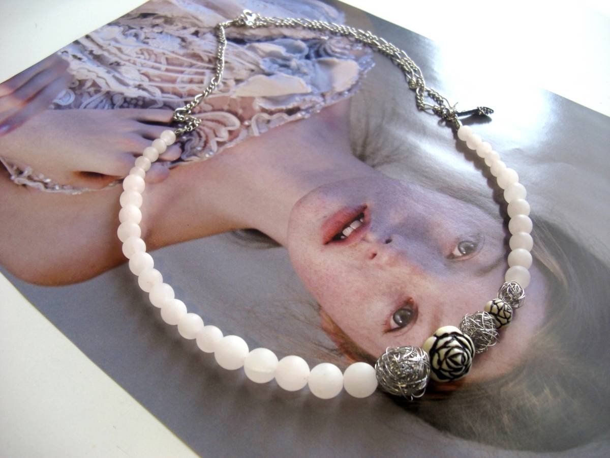 初夏のクローゼット・・シリーズです♪クレアの首飾り・・繊細なローズクォーツのネックレスです♪マットなやさしい表情のフロスト加工のローズクォーツに樹脂薔薇やワイヤーボールを合わせてロマンチックなネックレスです♪フロスト加工のローズクォーツは6ミリ、8ミリ、10ミリの丸玉です♪大きな樹脂薔薇は18ミリ位です♪ネックレスの長さは75センチ位で調節自由です♪チョーカー風にされて も素敵です♪お揃いのブレスレットも出品しています♪シンプルで飽きのこないいつまでも着けられるデザインを考えて作りました!ハンドメイドをご理解頂い てノークレーム、ノーリ ターンでお願いします