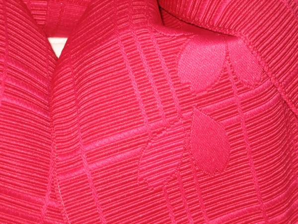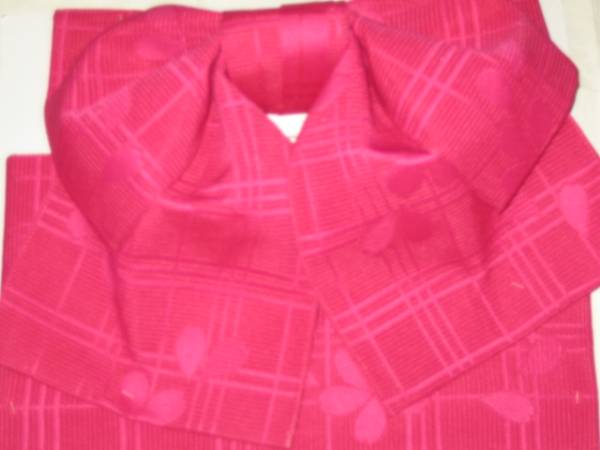 女性yukata用、地紋柄結び帯  濃いピンク ポリエステル  新品(織り地紋柄ありです。波状の写りはレンズの光学的ないたずらで現品にはありません、また薄く濃く写っている場合もあります)、胴部--帯巾約17,0cmx長さ約130cm、リボン部は横に約30cm。見た範囲で汚れないと思いますが、着用に差し支えない薄汚れ(多分ない?)はあってものお値段で出品です。