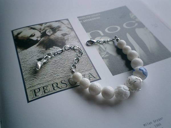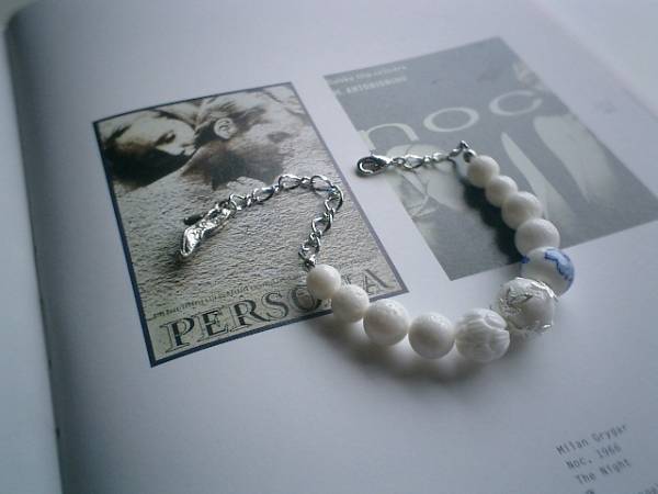 恋愛映画の余韻・・シリーズです♪ニュアンスのある白でまとめたブレスレットです♪白珊瑚は8ミリ、10ミリ、12ミリ、14ミリの大きさ違いの丸玉です♪彫りボーンや濃紺の花模様のチャイナビーズを合わせて大人のロマンチックしています♪長さは全長24センチ位で調節自由です♪お揃いのネックレスやピアスも出品しています♪シンプルで長く着けられるデザインを考えて作りました♪ハンドメイドをご理解頂いてノークレーム、ノーリターンでお願いします♪