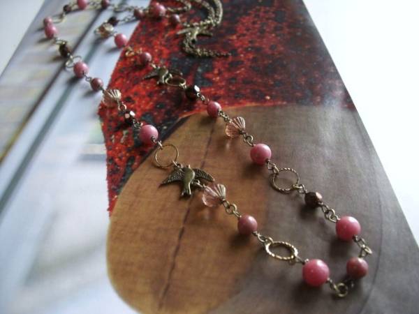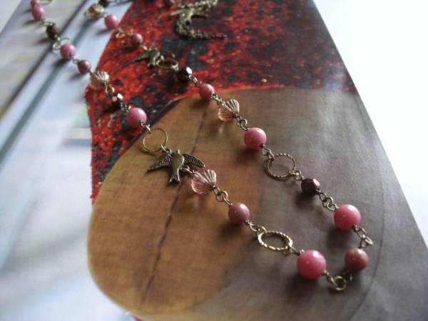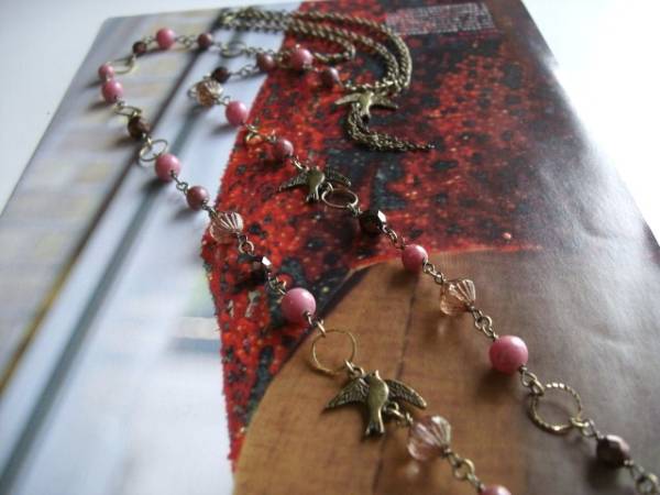 パリの衣裳部屋・・シリーズです♪屋根裏の宝石箱・・シックなロードナイトのネックレスです♪ダークピンクのロードナイトにチェコビーズや小鳥さんのチャームを合わせてアンティークな表情です♪ロードナイトは6ミリ、8ミリの丸玉です♪小鳥さんのチャームは20ミリ位です♪長さは全長105センチ位で調節自由です♪2連にされても素敵です♪♪お揃いのブレスレットも出品しています♪シンプルで飽きのこないいつまでも着けられるデザインを考えて作りました!ハンドメイドをご理解頂いてノークレーム、ノーリターンでお願いします