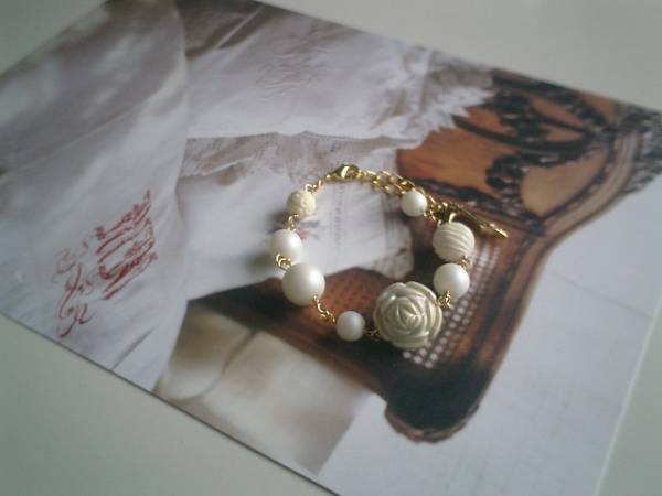 コゼットの裁縫箱・・シリーズです♪やさしい夢を見て・・ふんわりやさしいオフ・ホワイトのブレスレット2点セットです♪色々な組み合わせで楽しんでいただけます♪マットな樹脂パールや編みフラワー、樹脂薔薇や編みボールやサテンボール、彫りボーンなどを集めてロマンチックな表情です♪編みフラワーのブレスレットは12ミリから35ミリ位までのサテンボールや編みボール、編みフラワーを合わせました♪長さは全長23センチ位で調節自由です♪大きな樹脂薔薇のブレスレットは8ミリから12ミリ位までのマット樹脂パールに17ミリ位の樹脂薔薇、12ミリの彫りボーンを合わせました♪長さは全長23センチ位で調節自由です♪どちらもホワイト・ベージュ色でまとめてふんわりやさしい表情です♪それぞれ単品でも出品しています♪♪お揃いのネックレスも出品しています♪シンプルで飽きのこないいつまでも着けられるデザインを考えて作りました!ハンドメイドをご理解頂いてノークレーム、ノーリターンでお願いします