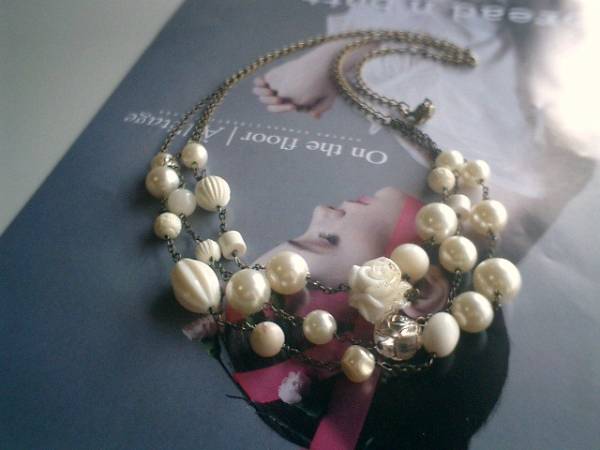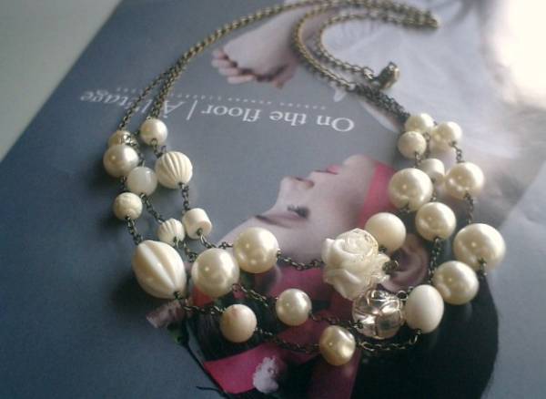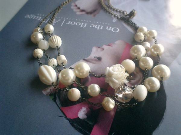 休日のシネマ・・シリーズです♪ドラマチックに恋して・・ふんわりやさしいオフホワイトの3連のネックレスです♪樹脂パールやアンティークビーズや樹脂薔薇を合わせてロマンチックな表情です♪軽い素材を選んで使ったので普段使いからお出かけまで軽やかに着けていただけます♪樹脂パールは10ミリから14ミリ位までの丸玉やバロックです♪樹脂薔薇は20ミリ位です♪長さは全長72センチ位で調節自由です♪チョーカー風に着けられても素敵です♪お揃いのブレスレットも出品しています♪シンプルで合わせやすいデザインを考えました♪ハンドメイドをご理解いただいてノークレーム、ノーリターンでお願いします♪