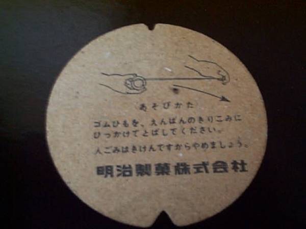 当時物です。キズ、シミ、汚れがあります。ゴム紐を円盤の切り込み部分にひっかけて飛ばして遊ぶ物です。円盤の裏面に遊び方と明治製菓株式会社の印刷があります。サイズは直径約4.5㎝位です。以上わかる部分のみ書きましたが写真、質問等で判断お願い致します。落札後はノークレーム、ノーリターンお願い致します。発送は日本郵便のレターパックライト(\430円・梱包時の厚さ3㎝以内、追跡番号付きです。)にての発送です。落札金額+¥430円です。レターパックライトには品物に保険がついておりません。紛失、破損の場合 当方は補償の対応できません。保険付き希望の場合ゆうパックにて発送します。発送方法は以上の方法でしか対応できませんのでご理解の上 入札お願い致します。