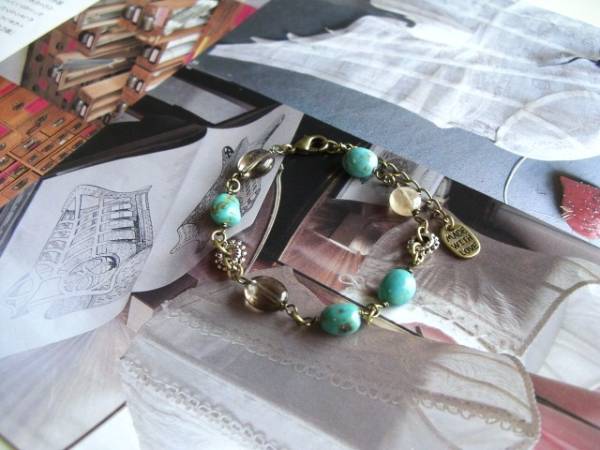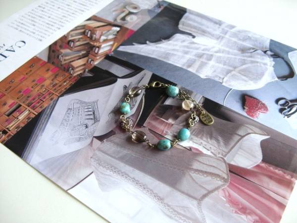 愛らしさのスパイス・・シリーズです♪初夏の香り・・シックなターコイズのブレスレットです♪ターコイズは9ミリから10ミリ位のタンブルです♪オーバルのスモーキークォーツやコインのルチルクォーツやデザインリングを合わせて可憐な表情です♪長さは16センチ+アジャスター6センチで最長22センチ位です♪お揃いのネックレスも出品しています♪シンプルで合わせやすいデザインなので長く着けていただけると思います♪ハンドメイドをご理解頂いてノークレーム、ノーリターンでお願いします♪