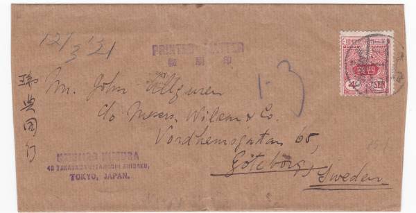 田沢旧大正毛紙4銭貼外信重量便印刷物 櫛型印 白金/10.1.30/后4-6
