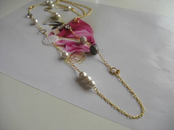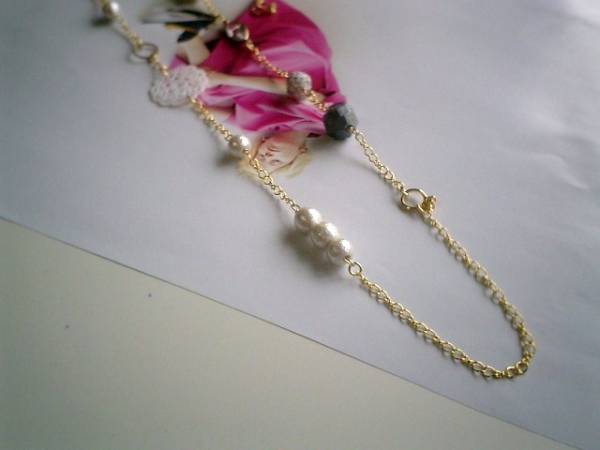可愛さのスパイス・・シリーズです♪パール・レシピ帖・・ふんわりやさしいコットンパールのネックレスです♪とても軽いのでずっと着けていただけたらと思います♪8ミリのコットンパールはビンテージビーズやシャネルビーズやリングチャームや透かしシェルを合わせて華やかなデザインです♪長さは全長105センチ位で調節自由です♪2連にされても素敵です♪お揃いのネックレスやブレスレットも出品しています♪シンプルで飽きのこないいつまでも着けられるデザインを考えて作りました!ハンドメイドをご理解頂いてノークレーム、ノーリターンでお願いします