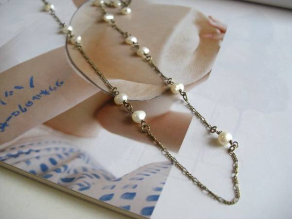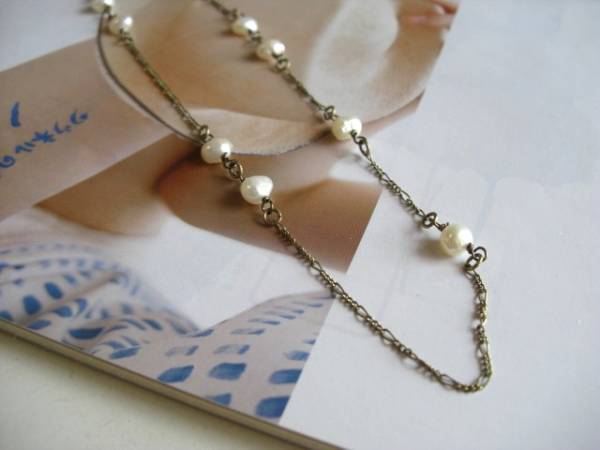 ビター・ガール・・シリーズです♪パールの物語・・ふんわりやさしい淡水パールのネックレスです♪オフ・ホワイトのバロックの淡水パールに華奢なチェーンを合わせてアンティークモダンな雰囲気です♪6×8ミリ位のバロックの淡水パールを華奢なチェーンで紡ぎました♪長さは85センチ+アジャスター10センチで最長95センチ位です♪お揃いのネックレスやブレスレットも出品しています♪シンプルで飽きのこないいつまでも着けられるデザインを考えて作りました!ハンドメイドをご理解頂いてノークレーム、ノーリターンでお願いします