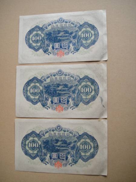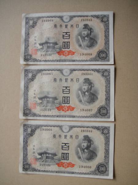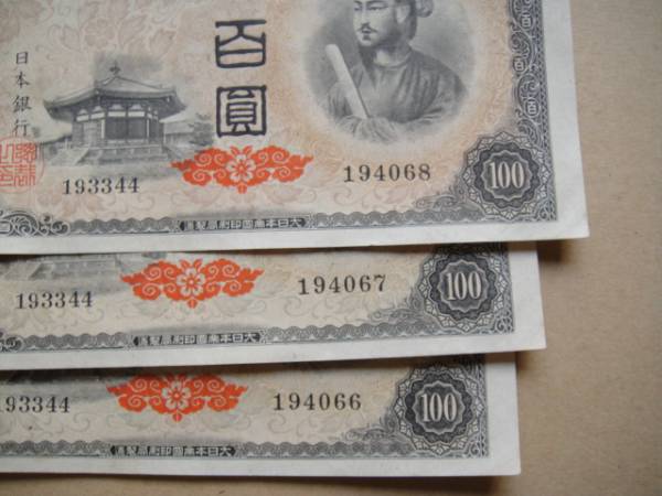 ●E52 4次100円札  四次百円札 3枚連番号 準未~極美品 シミ有●