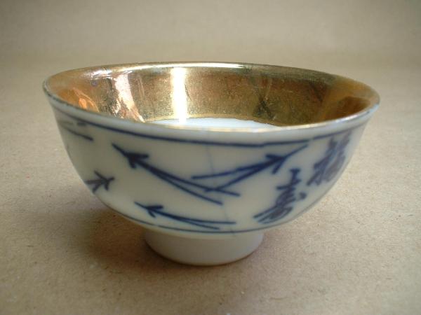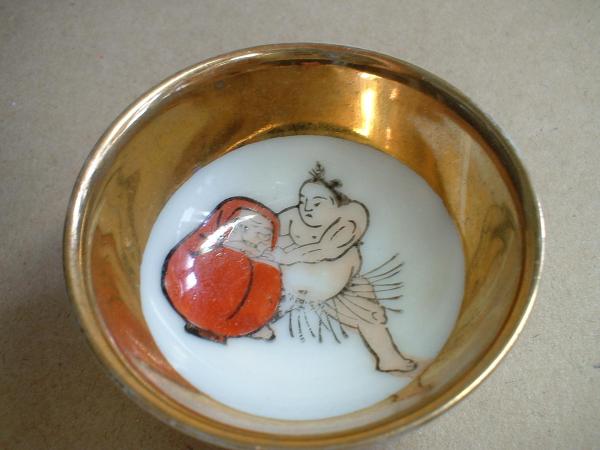 明治期頃の達磨と関取の相撲図・盃です。大変珍しい図柄です。口径5.5×底2.2×高3センチです傷はありません。