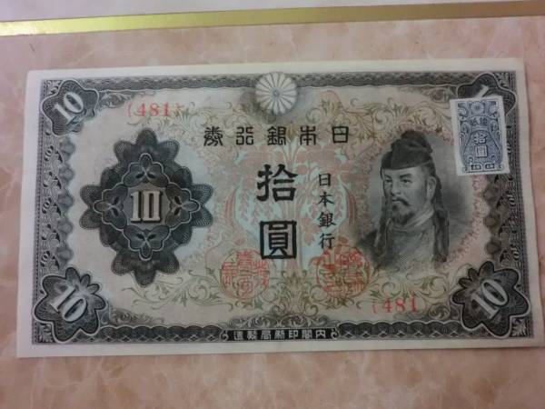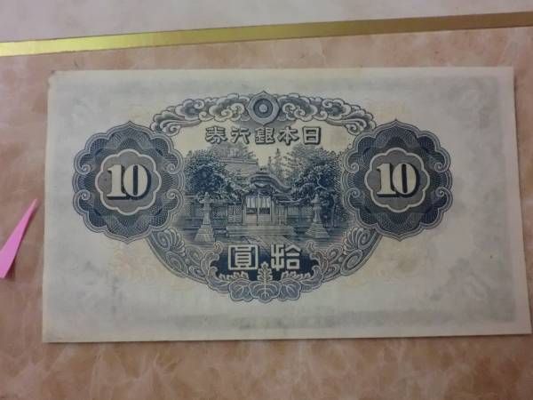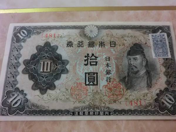改正不換紙幣10円 3次10円の証紙付で裏の印刷が左寄りです。