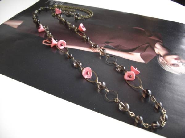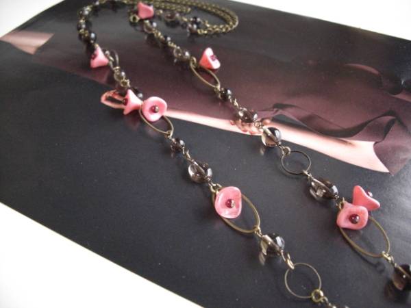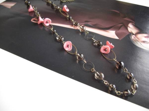 モダン・ガール・・シリーズです♪秘めた恋・・繊細なスモーキークォーツとチェコのお花のネックレスです♪神秘的なブラウンカラーのスモーキークォーツにシックなモーヴピンクのチェコのお花やチェコビーズやデザインリングを合わせてロマンチックな表情です♪スモーキークォーツは6ミリから14ミリ位までの丸玉やオーバルなどのデザイン違いです♪長さは全長102センチ位で調節自由です♪2連にされても素敵です♪お揃いのネックレスやブレスレットやイヤリングも出品しています♪シンプルで飽きのこないいつまでも着けられるデザインを考えて作りました!ハンドメイドをご理解頂いてノークレーム、ノーリターンでお願いします