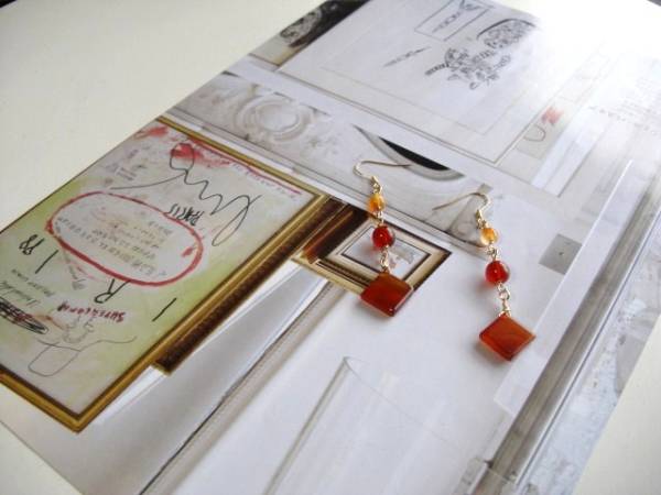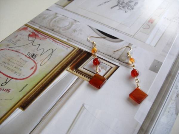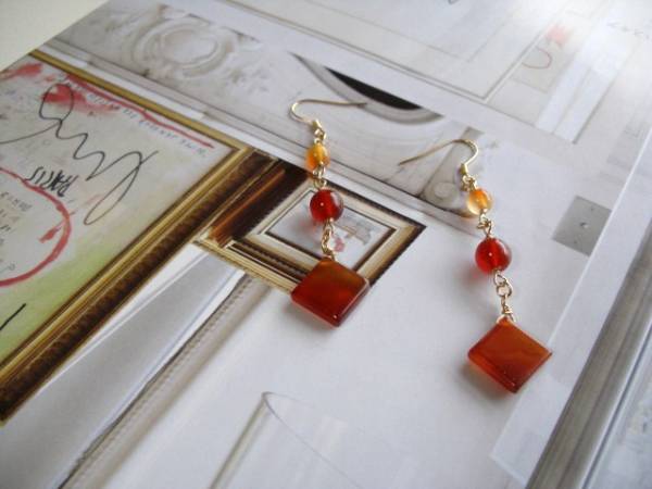 ニューヨーク・テイスト・・シリーズです♪やさしい春色・・ふんわりやさしいオレンジ色のカーネリアンのピアスです♪丸玉やスクエアのカーネリアンを集めてニューヨーク・テイストのデザインです♪6ミリ、8ミリの丸玉、13ミリのスクエアのカーネリアンです♪長さは8センチ位です♪イヤリングにも変更出来ます♪お揃いのネックレスやブレスレットも出品しています♪シンプルで飽きのこないいつまでも着けられるデザインを考えて作りました!ハンドメイドをご理解頂いてノークレーム、ノーリターンでお願いします