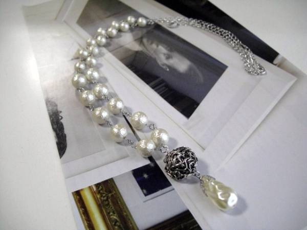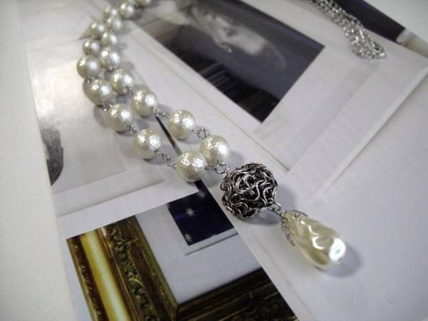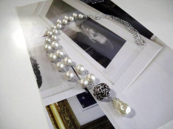 巴里色スケッチ・・シリーズです♪貴婦人のパール・・ふんわりやさしいオフホワイトのコットンパールのネックレスです♪とても軽いので長く着けていただけたらと思います♪丸玉のパールにビンテージビーズやデザインメタルチャームを合わせてクラシカルな表情です♪6ミリ、8ミリの丸玉のパールにトップは17ミリのメタルチャームとしずく型のビンテージビーズです♪長さは78センチで調節自由です♪トップは5センチ位です♪お揃いのネックレスやブレスレットも出品しています♪シンプルで飽きのこないいつまでも着けられるデザインを考えて作りました!ハンドメイドをご理解頂いてノークレーム、ノーリターンでお願いします