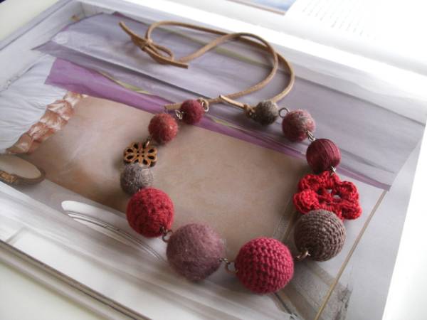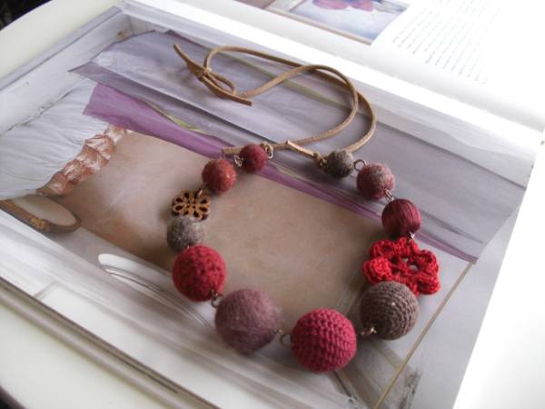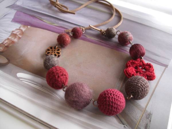 色で遊んで・・シリーズです♪レッド・セレクト・・深い赤のお色でまとめたネックレスです♪12ミリから32ミリ位までのダークブラウン、モスブラウンやレッドなどの編みボールや編みフラワー、サテンボールや透かしウッドを集めました♪コーヒーブラウンのスェード紐を合わせて甘すぎない大人のロマンチックしています♪ネックレスの長さは全長90センチ位です♪短く結んでチョーカー風にされても素敵です♪お揃いのブレスレットも出品しています♪ハンドメイドをご理解いただいてノークレーム・ノーリターンでお願いします♪