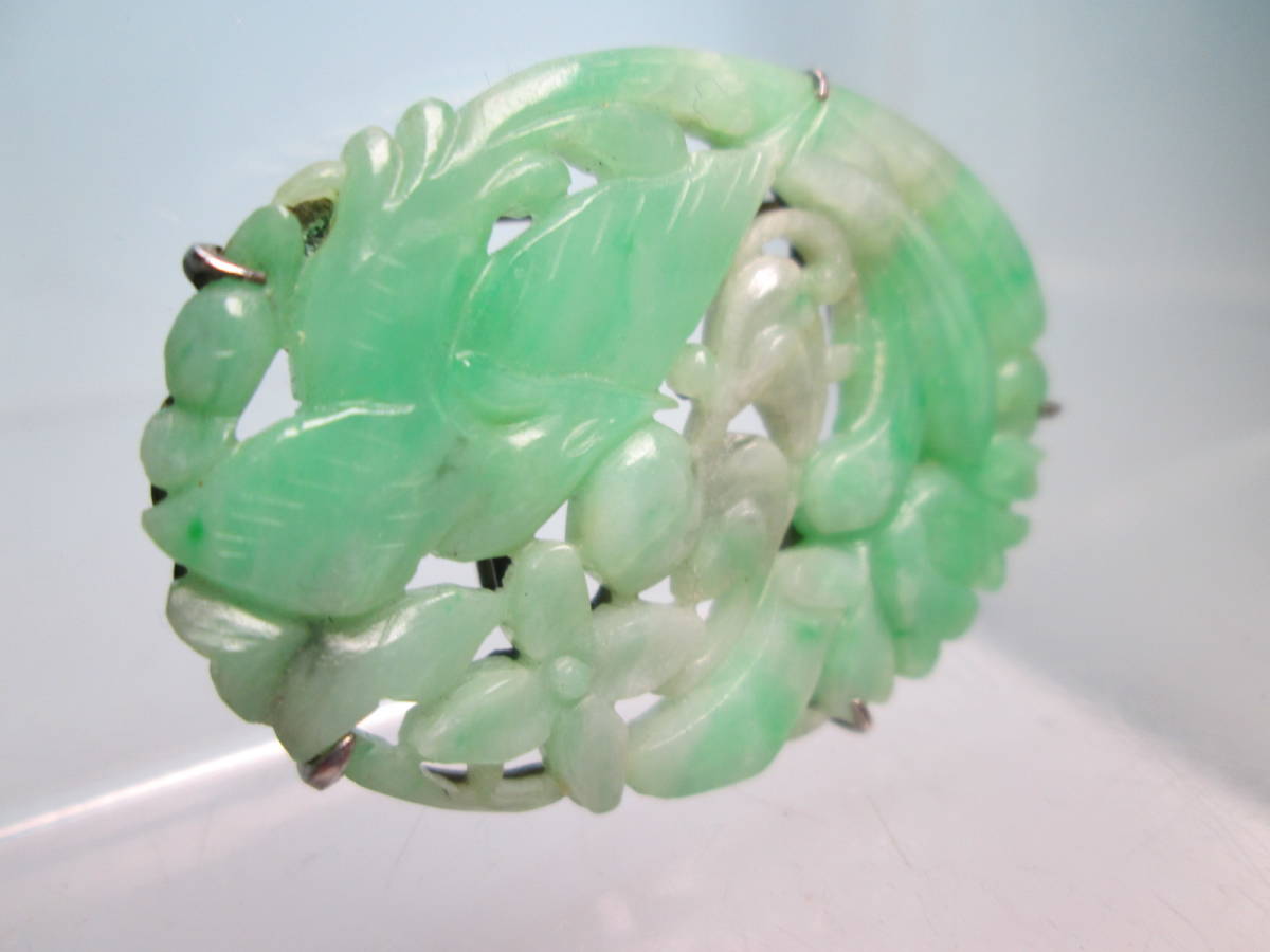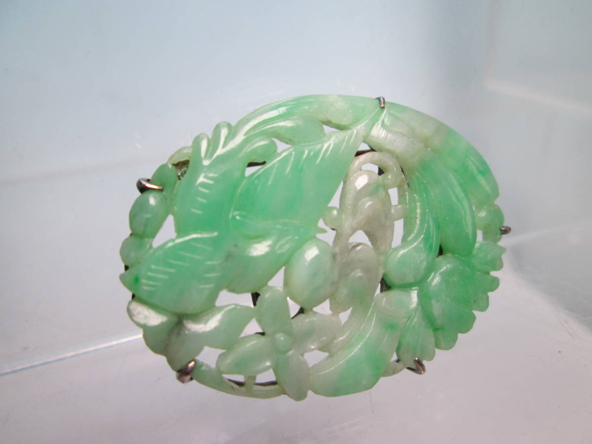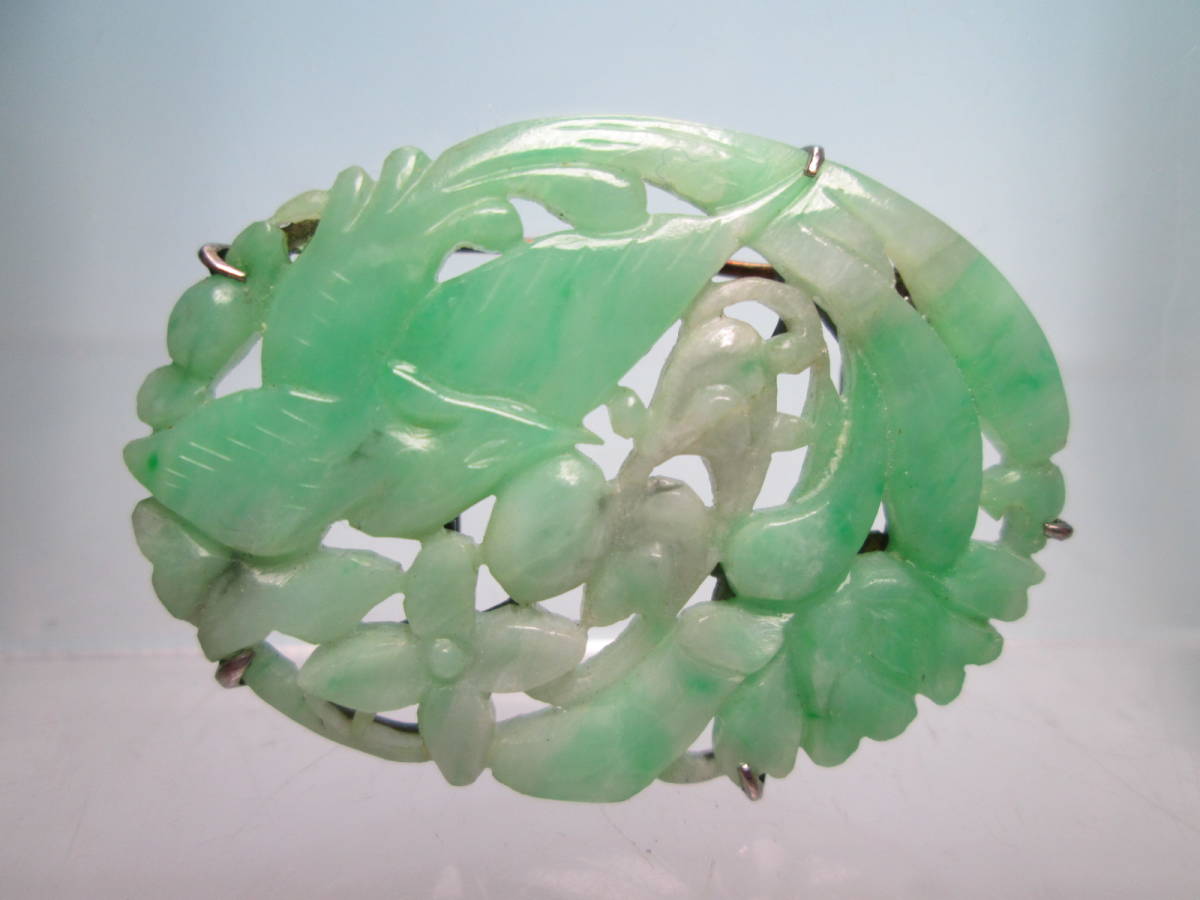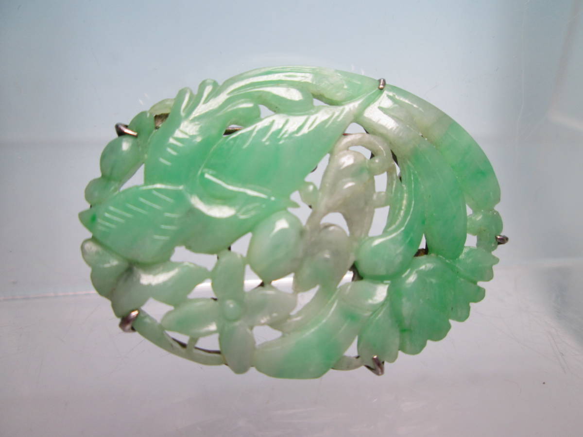 【江月】アンティーク・PM 本翡翠 鳳凰に花彫刻帯留め兼ブローチ 7,46g