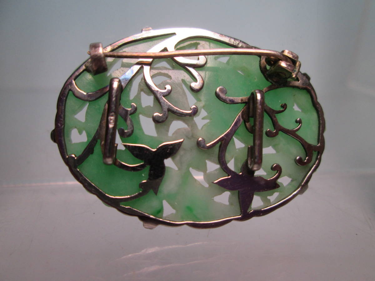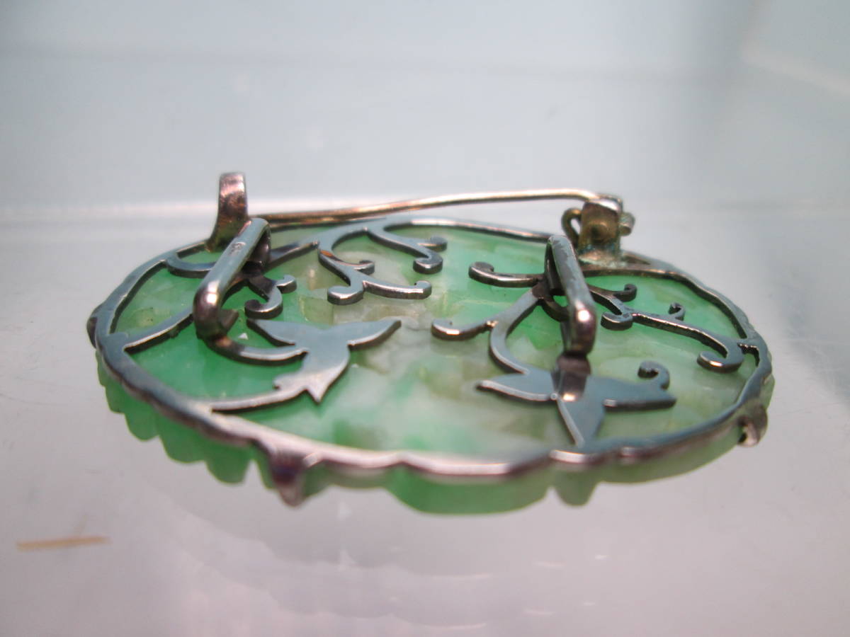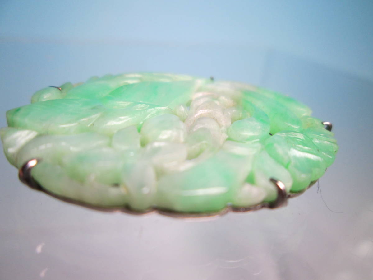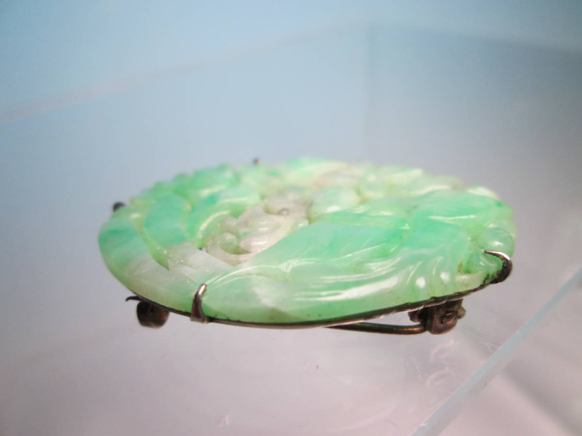 【江月】アンティーク・PM 本翡翠 鳳凰に花彫刻帯留め兼ブローチ 7,46g