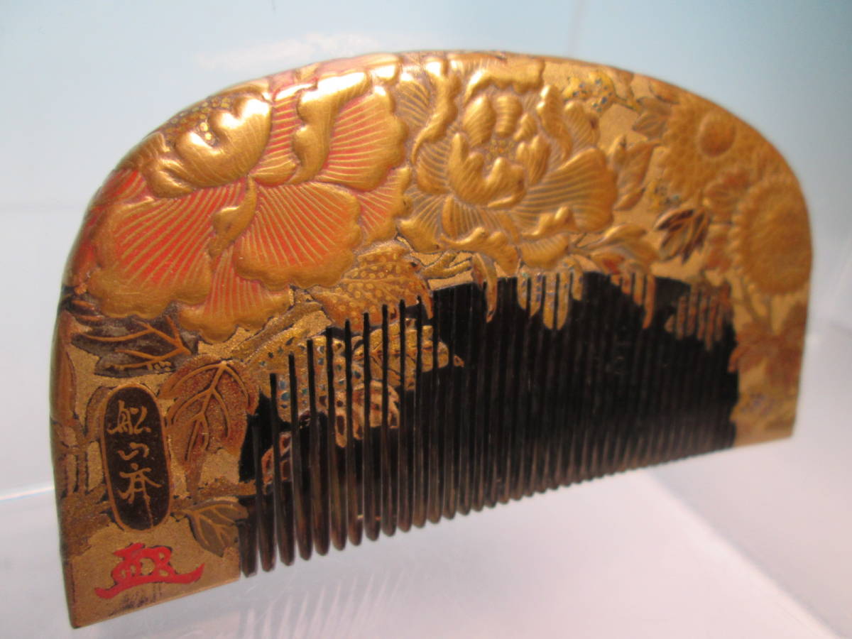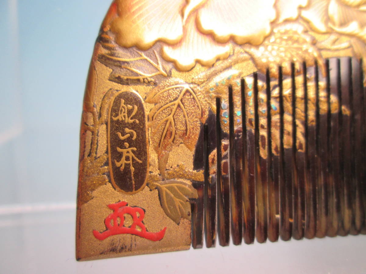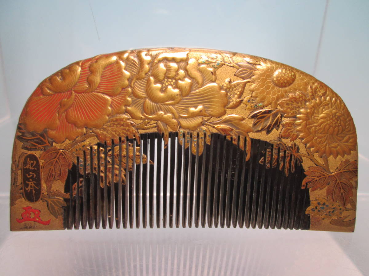 【江月】アンティーク・舩山斉作 本鼈甲 高金蒔絵牡丹菊花図の櫛