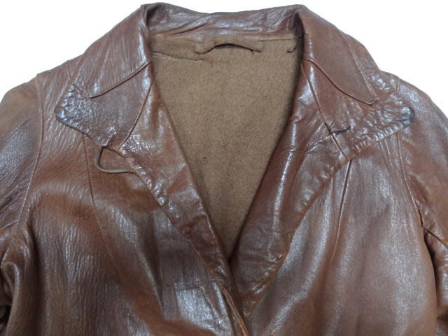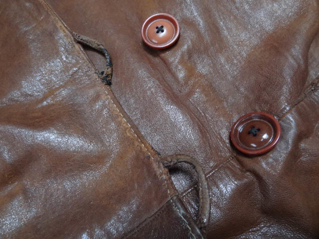 コンディション:全体に年代相応の使用感あります。画像7はボタンループとボタンデザインの確認画像,画像8は他よりも目立つ擦れた左肩の画像,画像9は左脇下のレザーのめくれと縁全体にある擦れ感の確認用,画像10は両腕の擦れ(特に左のほうが目立つ)の確認画像です。致命的なダメージなどもなく,レザーの硬化や嫌な臭いなどもありません。100年前のものであることを前提にグッドコンディションだといえます。全く問題なく着用可能です。ヴィンテージに理解のない方などは参加しないでください