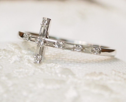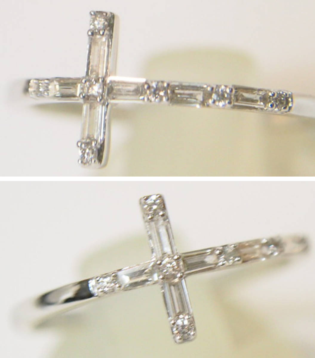 長方形とブリリアントカットの2種類のダイヤで人気のクロス型モチーフをデザインした18金ホワイトゴールド製リングです。