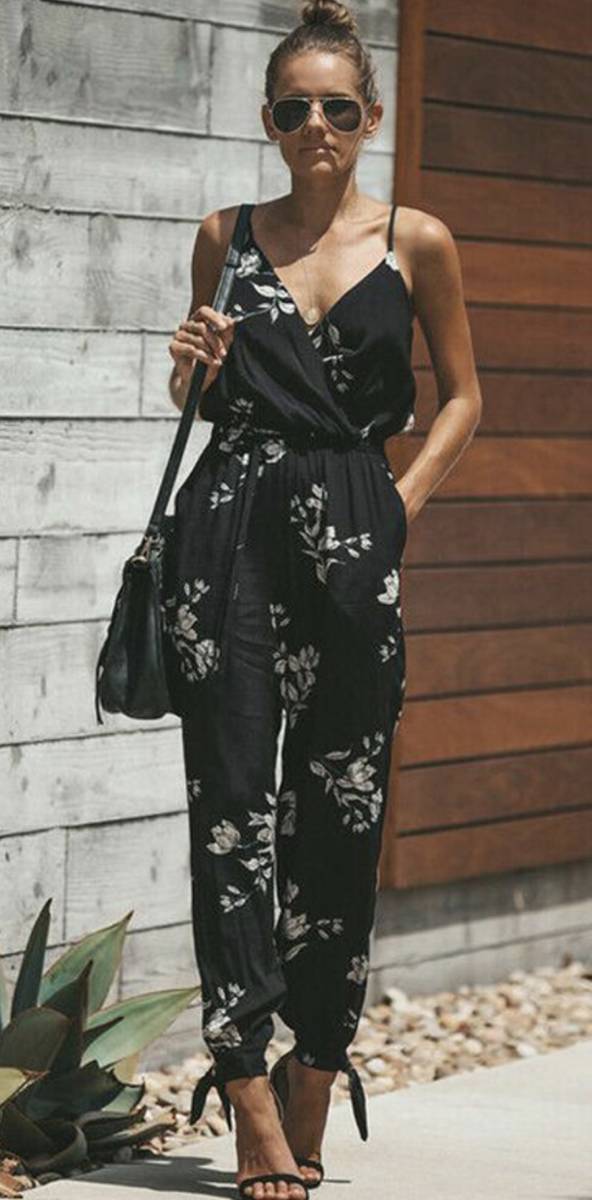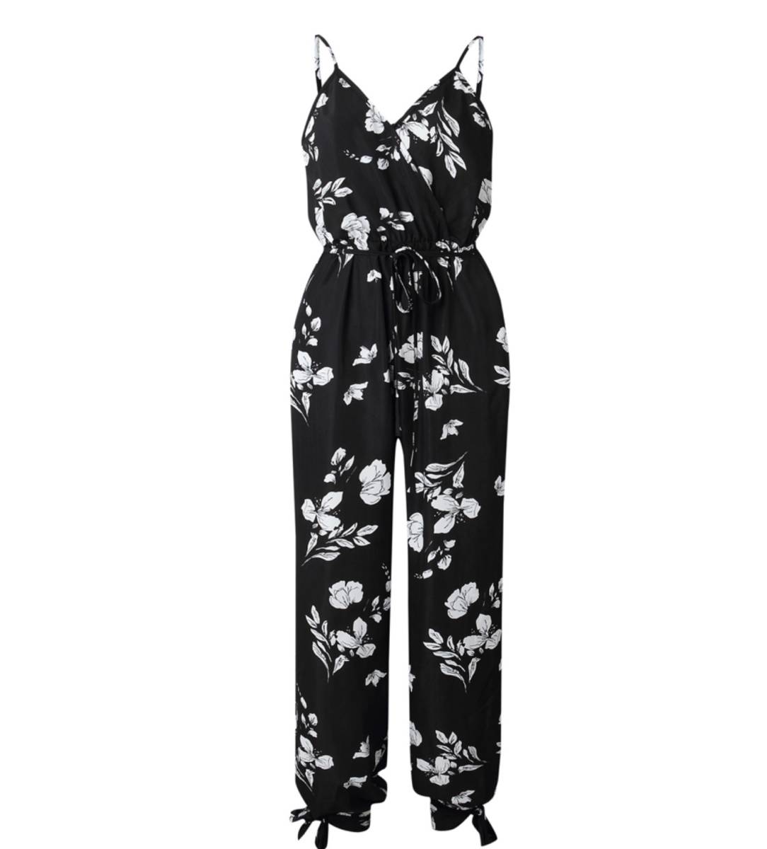 送料無料★新品・即決★オールインワン★フローラル柄レディースロンパース・花柄レディースジャンプスーツ★サイズM★ブラック