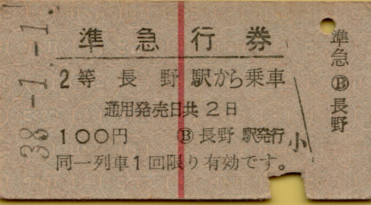 ◎ 国鉄【 準急行券 】長野駅 から 乗車 S38.1.1 長野駅 発行 2等 100円