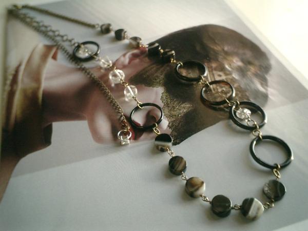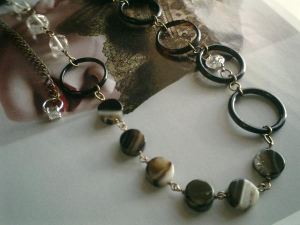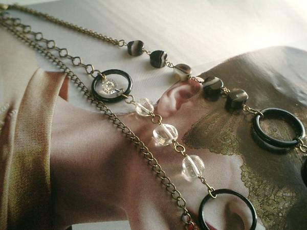 ニューヨーク・ニューヨーク!繊細な水晶とジルコニアとストライプオニキスとオニキスリングでキュートなネックレスを作りました♪ニューヨークモダンな雰囲気です♪♪水晶は10ミリ位のタンブル、ストライプオニキスは10ミリ位のコインでオニキスのリングは20ミリ位です♪繊細な輝きの8ミリのジルコニアとデザインチェーンを合わせてシックにさりげなく華やかで大人っぽい可愛さです♪長さは全長82センチ位で調節自由です。短くチョーカー風に着けても2連にしても可愛いです♪お揃いのブレスレットも出品しています。ハンドメイドをご理解頂いてノークレーム、ノーリターンでお願いします
