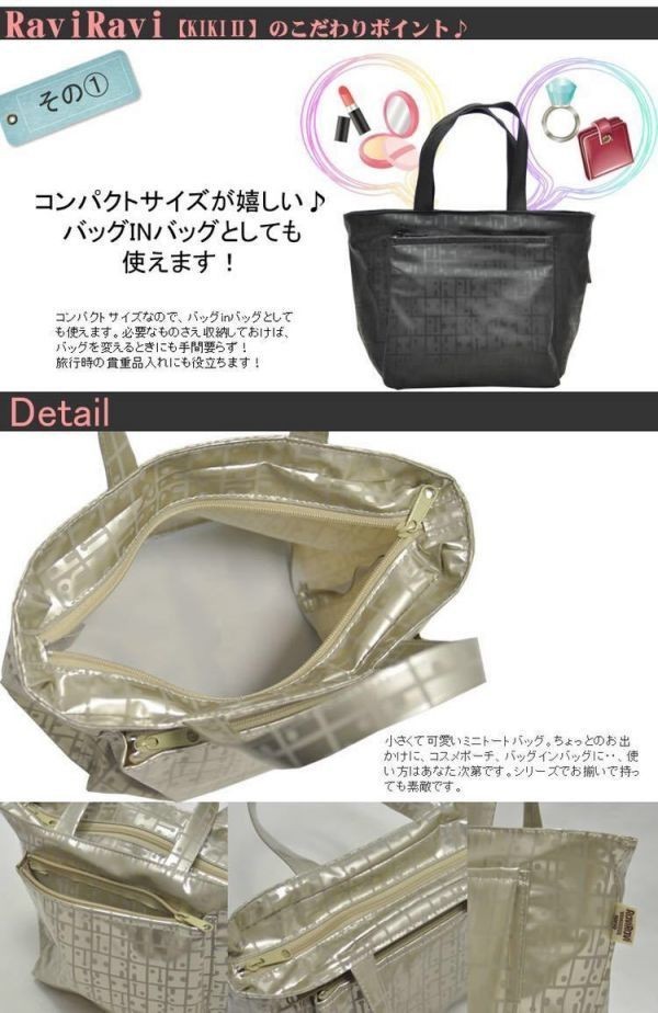 春・夏・秋・冬、一年中雨の日も使える「快適おでかけバッグ」老舗ヤマト屋RAVIRAVI(ラビラビ)のミニトートバッグ。バッグインバッグにしたり、ポーチにしたりと、シーンやスタイルに合わせた使い方ができます。軽くて、強い!他ではマネできない機能派ショルダーバッグ。裁断から縫製まで国内で行っている日本製です。日常使いから旅行まで対応する頼れる収納力はシーンを選ばずお使いいただけます。母の日ギフトや誕生日プレゼントなど、季節のイベントの贈り物にオススメ!!大切なあの人へのプレゼントにいかがですか。