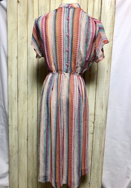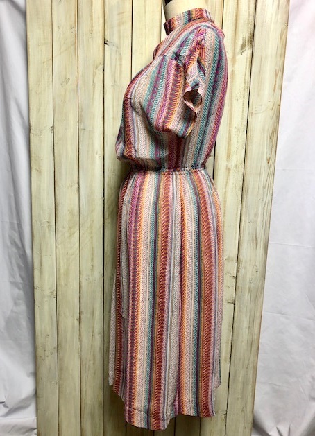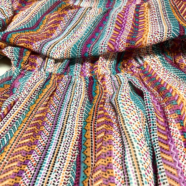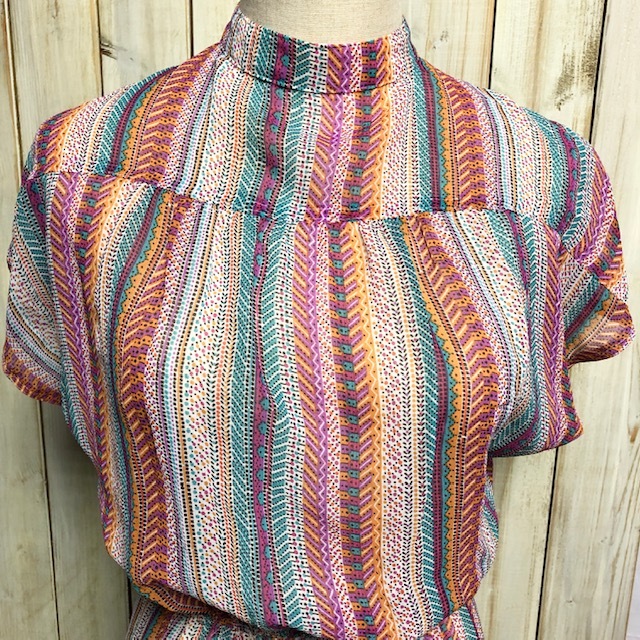 ●商品説明・・・70年代頃~のヴィンテージのレトロワンピースです。ややエスニック感のある柄で、やや透け感のある涼し気なシフォン生地です。スカート部分は裏生地付きになっています。素材は表地がポリエステルで、裏地がレーヨンです。