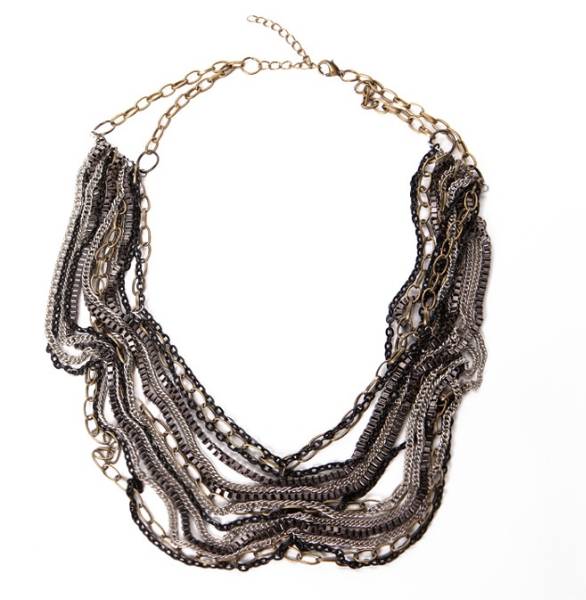 4種類のチェーンを大胆に使用したネックレス。ボリュームのあるチェーンが華やかなのでシンプルな服に合わせると映えます。カジュアルやパーティシーンにも使える便利なアイテムです。