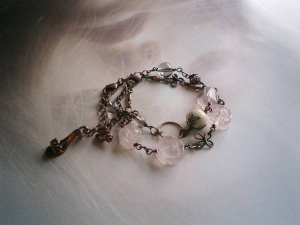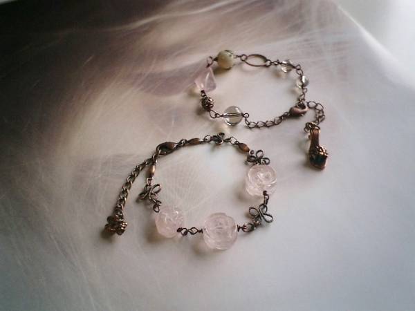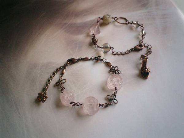 ニューヨーク・シティシリーズです♪やさしい夢に包まれて・繊細なローズクォーツとスモーキークォーツのブレスレット2本セットです♪2本を重ねて着けたりそれぞれ単品でも楽しんでいただけます♪シンプルなデザインは10ミリ、12ミリの両面薔薇のローズクォーツとお花のデザインチェーンを合わせました♪可憐な表情のブレスレットです♪長さは全長22センチ位で調節自由です♪スモーキークォーツは6ミリ、8ミリの丸玉や10×14ミリのフラットドロップです♪8ミリの丸玉のアフリカンオパールや12ミリのラフカットのローズクォーツやデザインチャームを合わせました♪シックにニューヨークモダンしています♪長さは全長22センチ位で調節自由です♪♪それぞれ単品でもお買い上げいただけます♪お揃いのネックレスも出品しています。ハンドメイドをご理解頂いてノークレーム、ノーリターンでお願いします