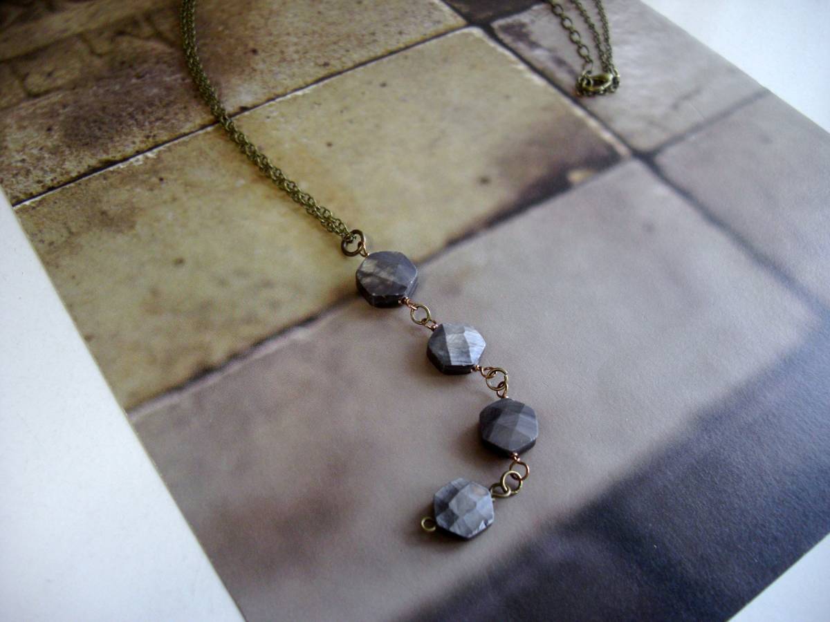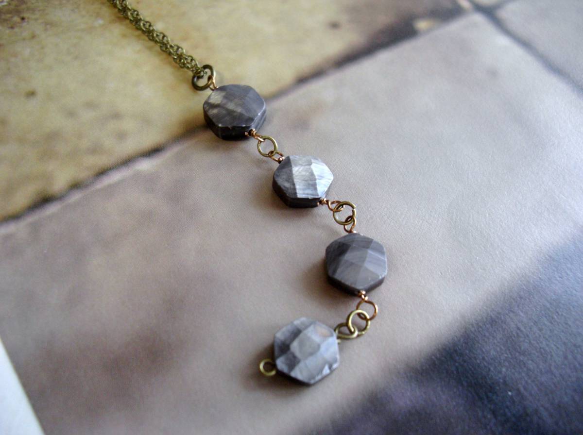 アリスの時間・・シリーズです♪グレーシェルの魔法・・神秘的なグレーシェルのネックレスです♪♪多面カットのグレーシェルはひっそりと可憐な 表情です♪個性的な12ミリと10ミリ位の大きさ違いの六角形のシェルを組み合わせました♪トップに4つのシェルを繋いでいます♪長さは70センチ+アジャスター7センチで最長77センチ位です♪トップは8センチ位です♪♪お揃いのネックレス、ブレスレット、ピアスも出品しています♪♪ シンプルで飽きのこないいつまでも着けられるデザインを考えて作りました!ハンドメイドをご理解頂いてノークレーム、ノーリターンでお願いします