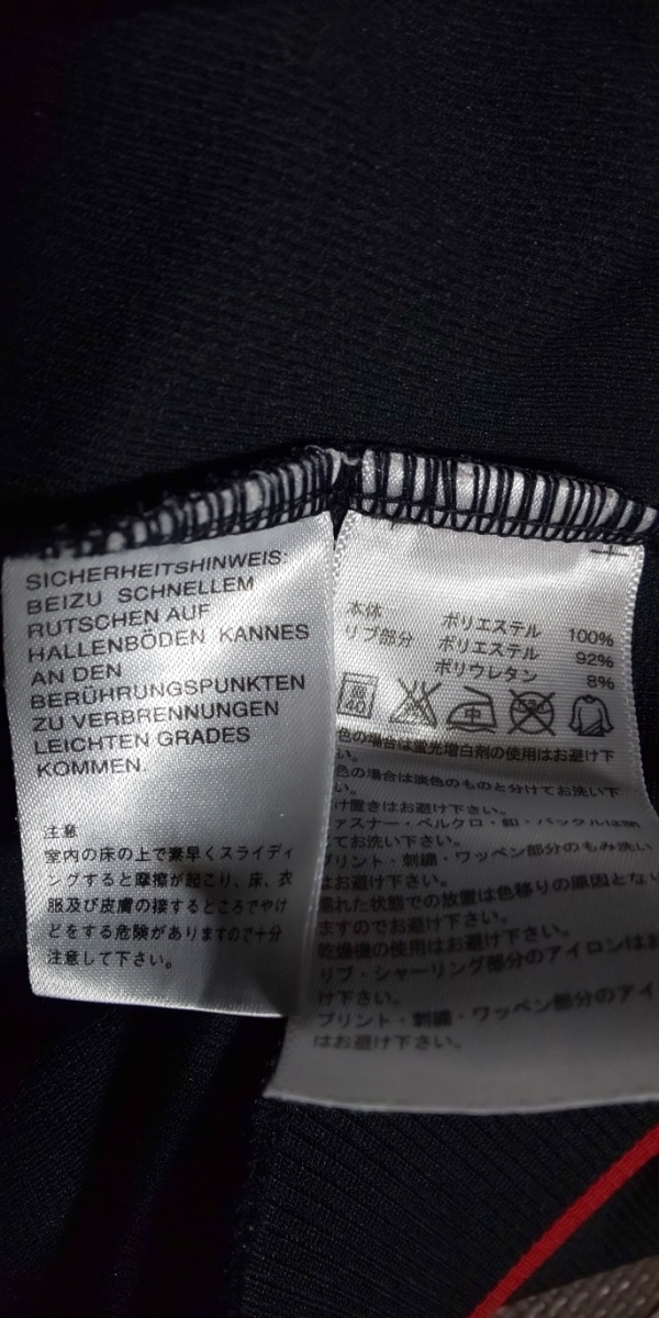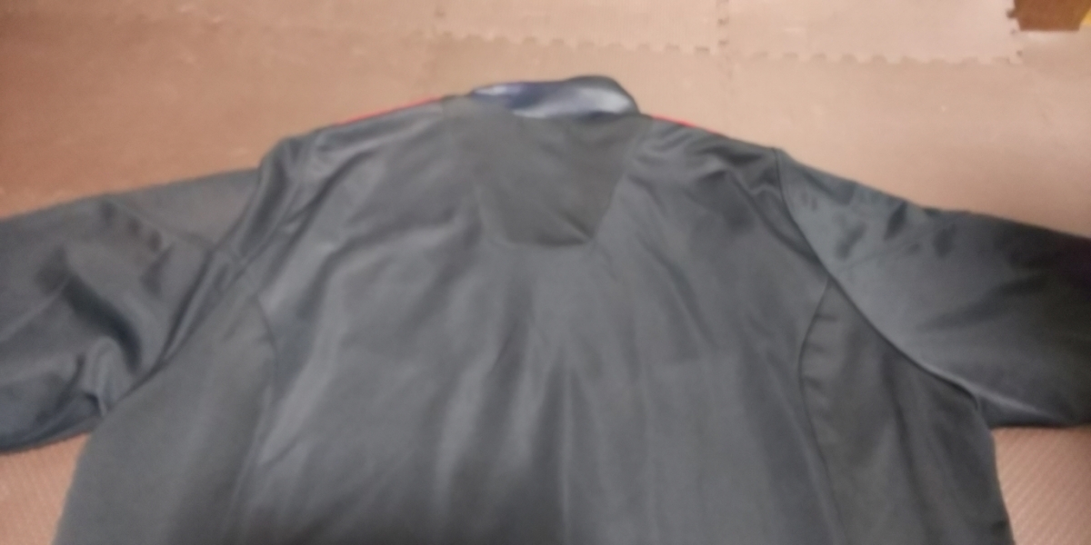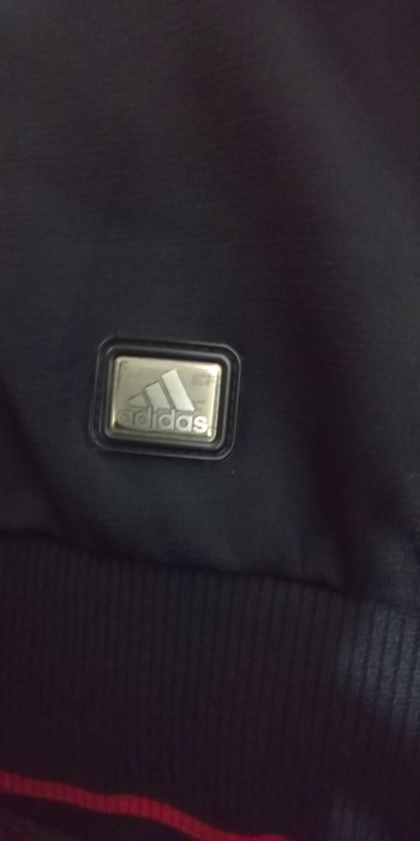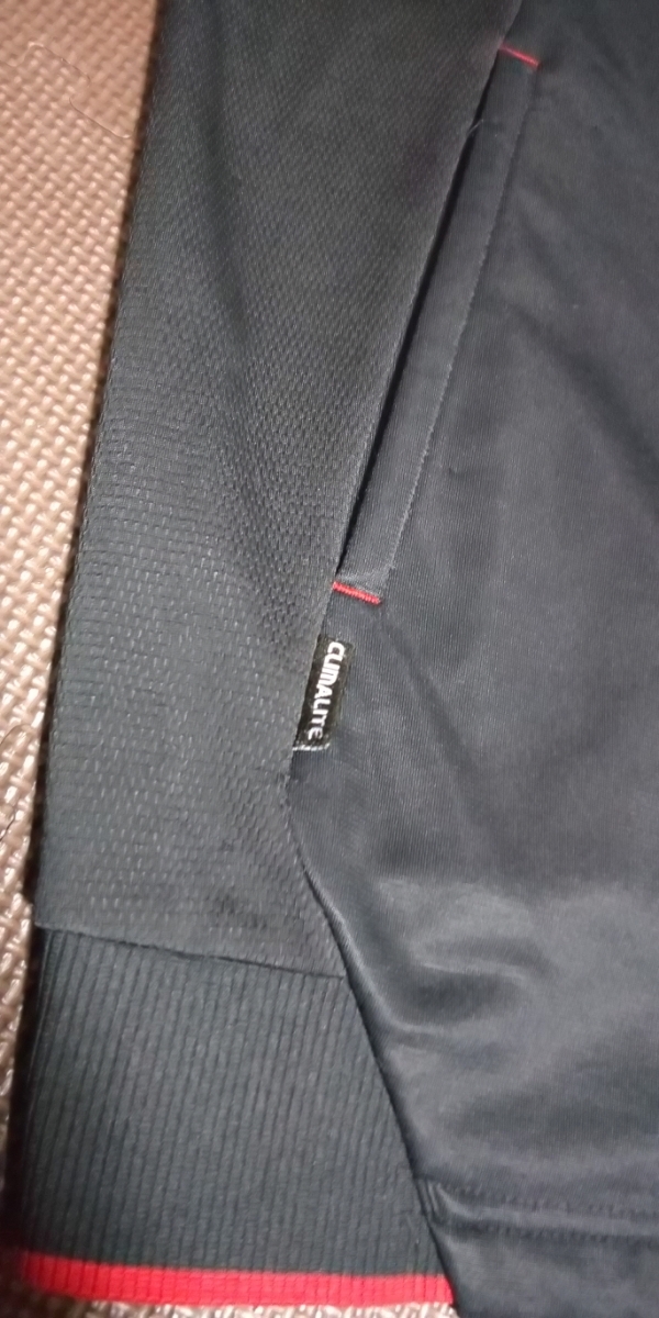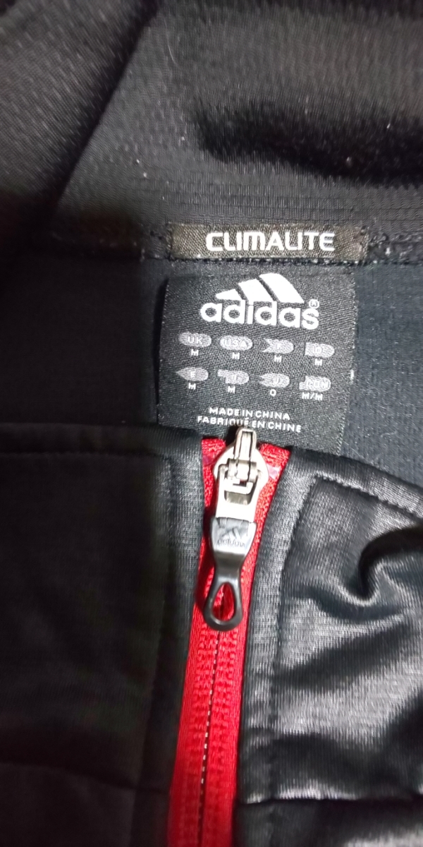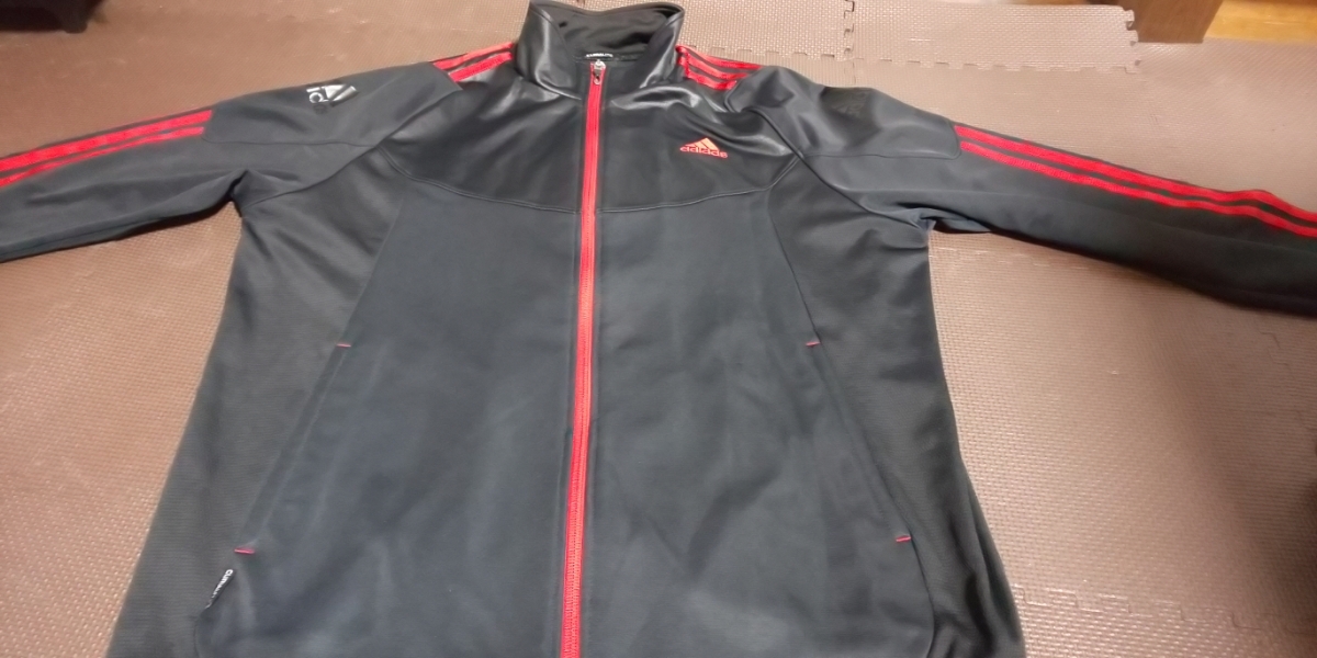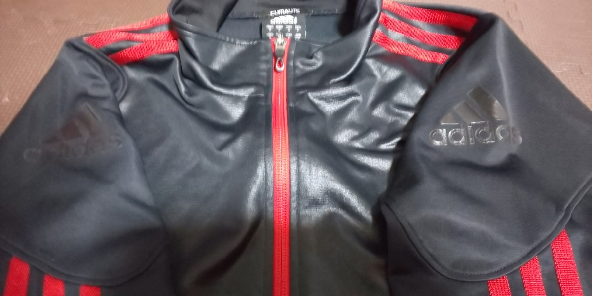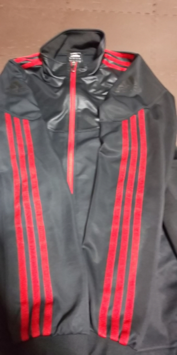 美品adidas黒、ロゴ、ライン赤、両肩ロゴ入りストレッチトップス