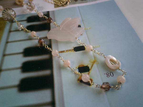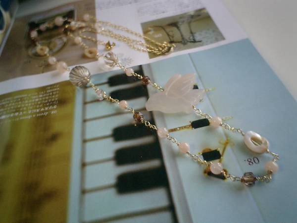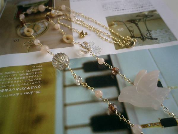 巴里の小さな宝石屋さんシリーズです♪幻想と怠惰・巴里の路地裏をイメージしたネックレスです♪儚げで繊細なイメージで作りました♪やさしい淡いピンクの小鳥さんのネックレスです♪シックなピンクでまとめてアンティークな雰囲気で作りました♪シックなピンクはピーチクォーツの6ミリと8ミリの丸玉です♪同じピーチクォーツの小鳥さんは40×32ミリ位です♪ベージュ色のシェルリングや8ミリのジルコニアやチェコのデザインビーズや樹脂ビーズを合わせて大人のロマンチックしています♪長さは全長102センチ位で調節自由です♪同じデザインの長さ違いやお揃いのブレスレットや同じシリーズも出品しています♪シンプルで長く着けられるデザインを考えて作りました!ハンドメイドをご理解頂いてノークレーム、ノーリターンでお願いします |