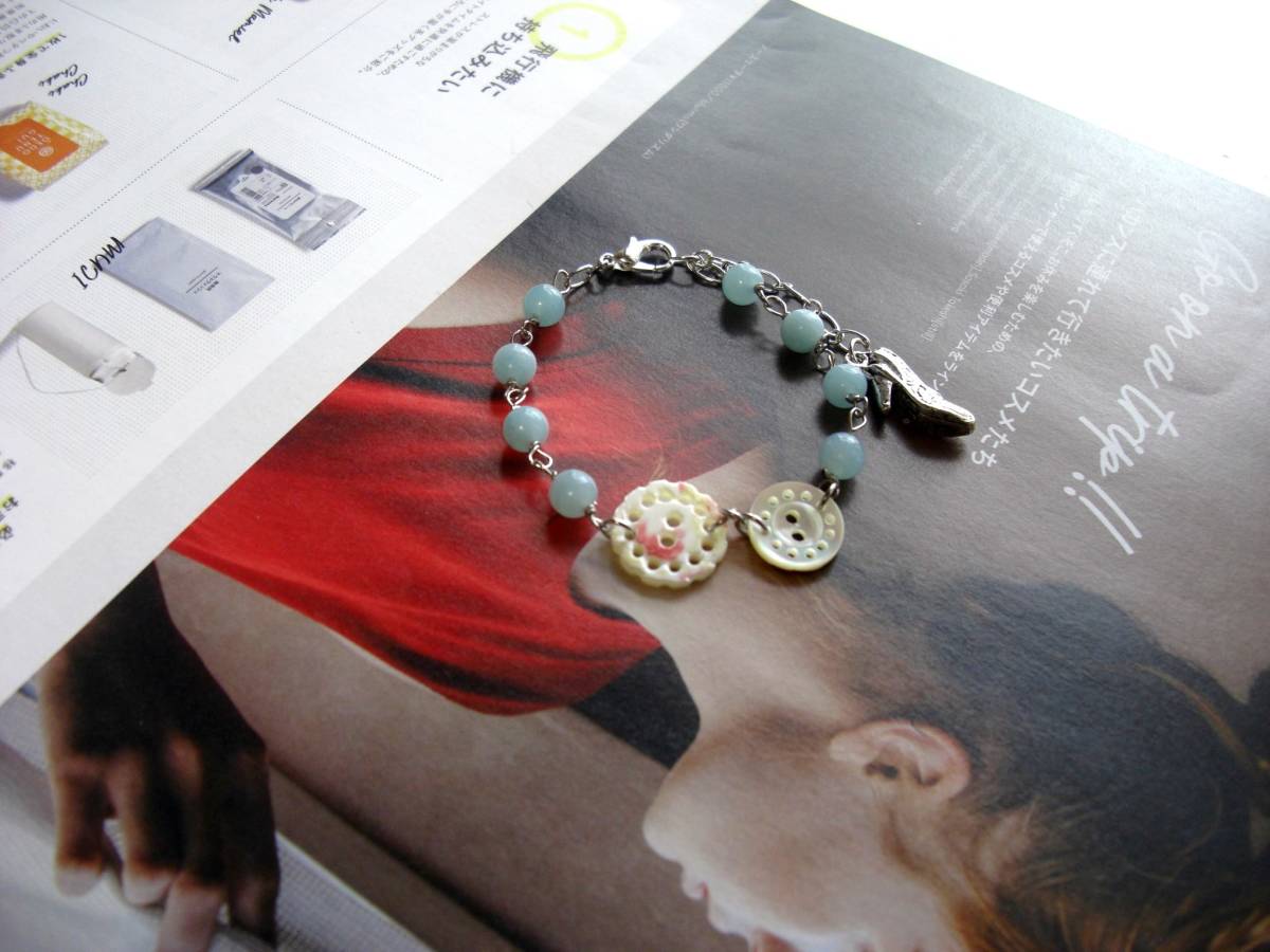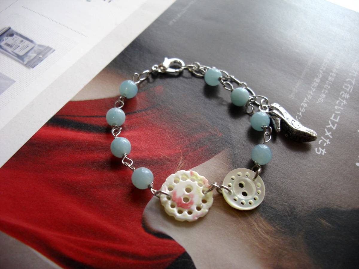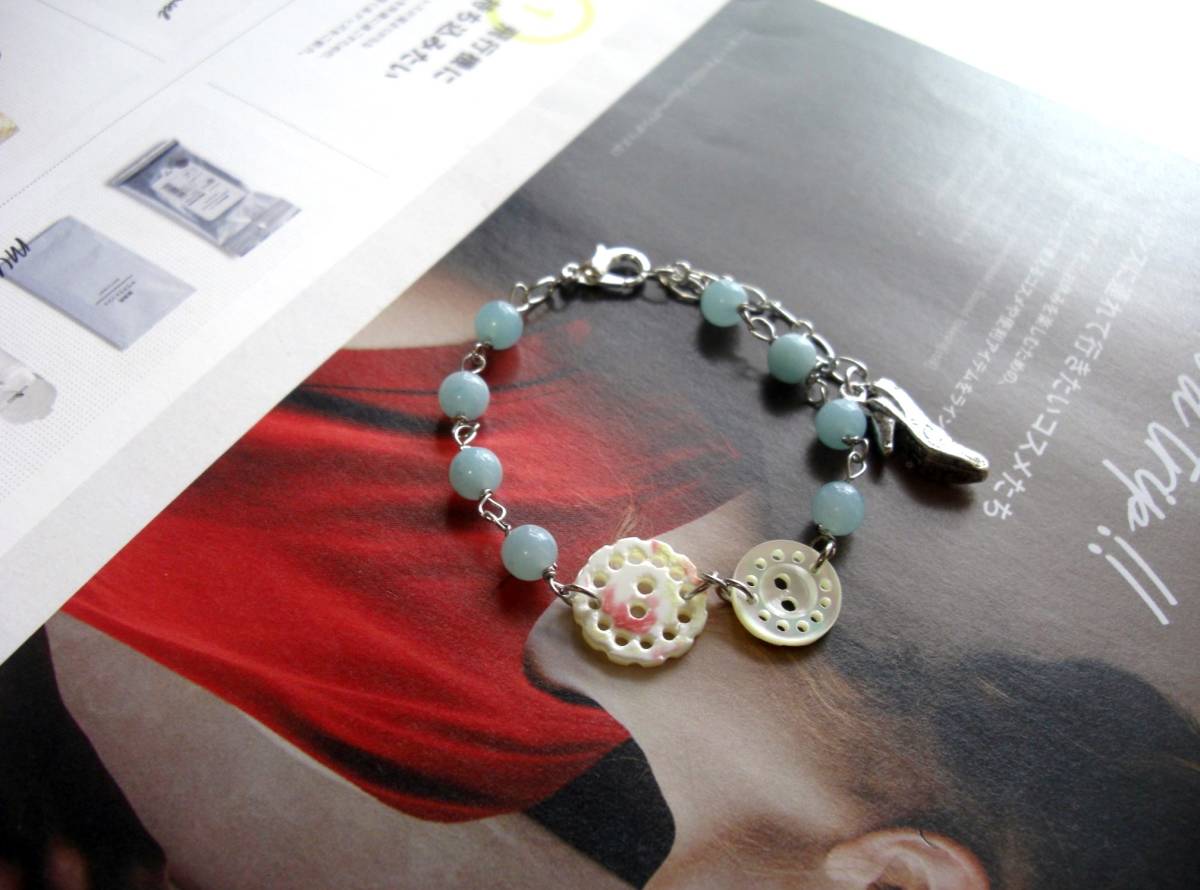 初夏の色を+して・・シリーズです♪可憐なレースと水色・・神秘的なアマゾナイトのブレスレットです♪6ミリのアマゾナイトに12ミリ、15ミリのシェルのレースボタンを合わせて可憐な表情です♪長さ全長23センチ位で調節自由です♪お揃いのネックレスやイヤリングも出品しています♪♪シンプルで飽きのこないい つまでも着けられるデザインを考えて作りました♪ハンドメイドをご理解頂いてノークレー ム、ノーリターンでお願いします