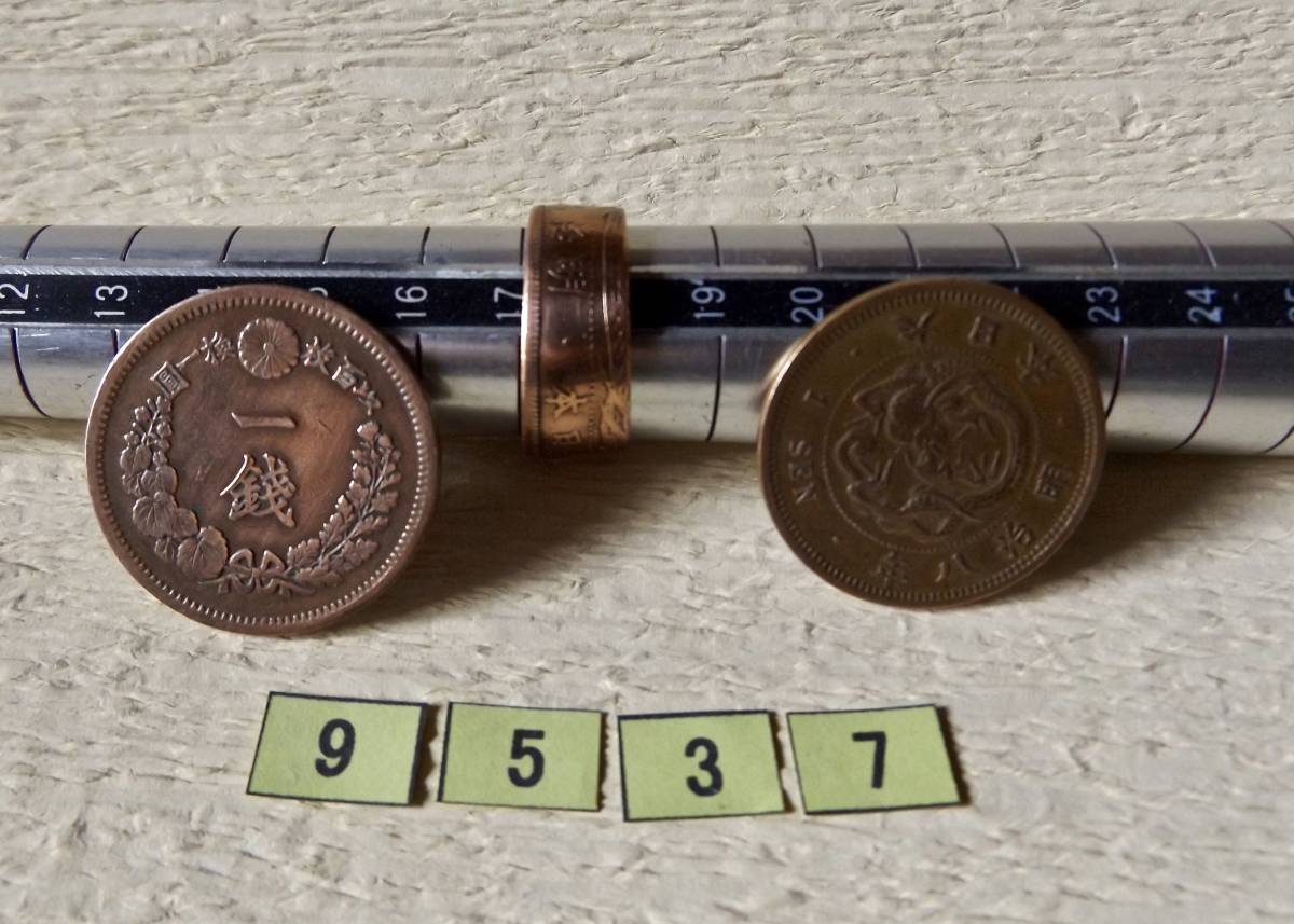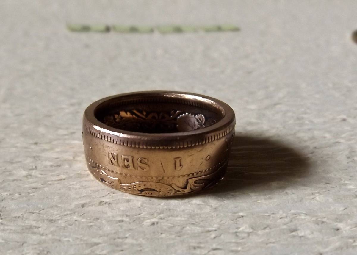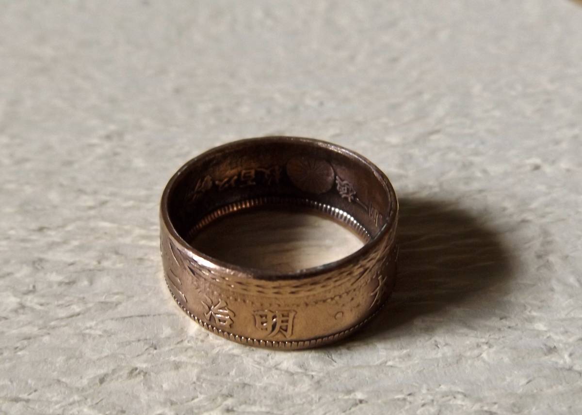 この商品は、明治20年発行の竜1銭銅貨を使用。銅貨に穴を明け木槌で叩いてコインリングに成形した1点ものです。