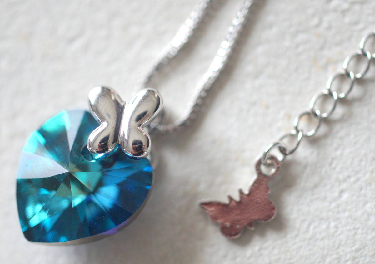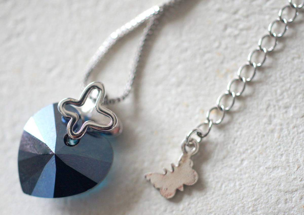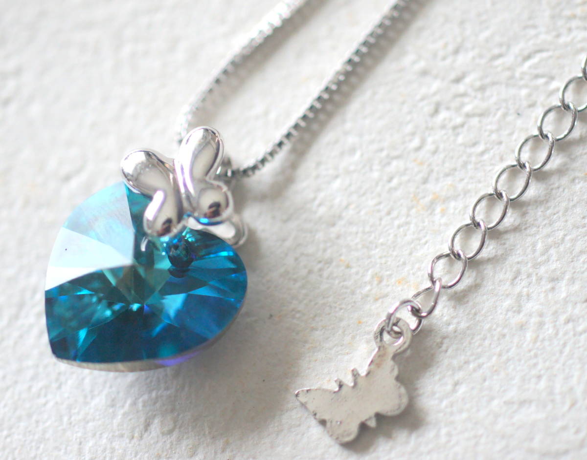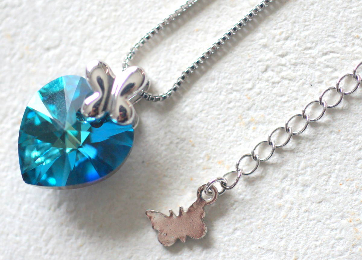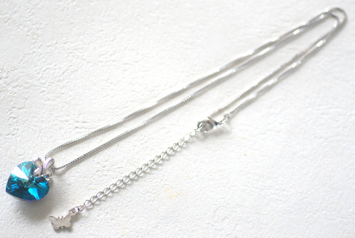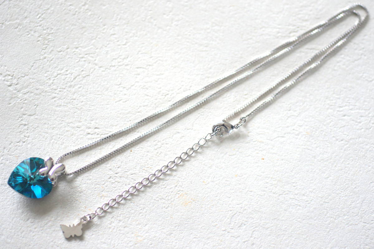 ブルー スワロフスキークリスタル ハートシェイプ 蝶ちょのカン付きネックレス