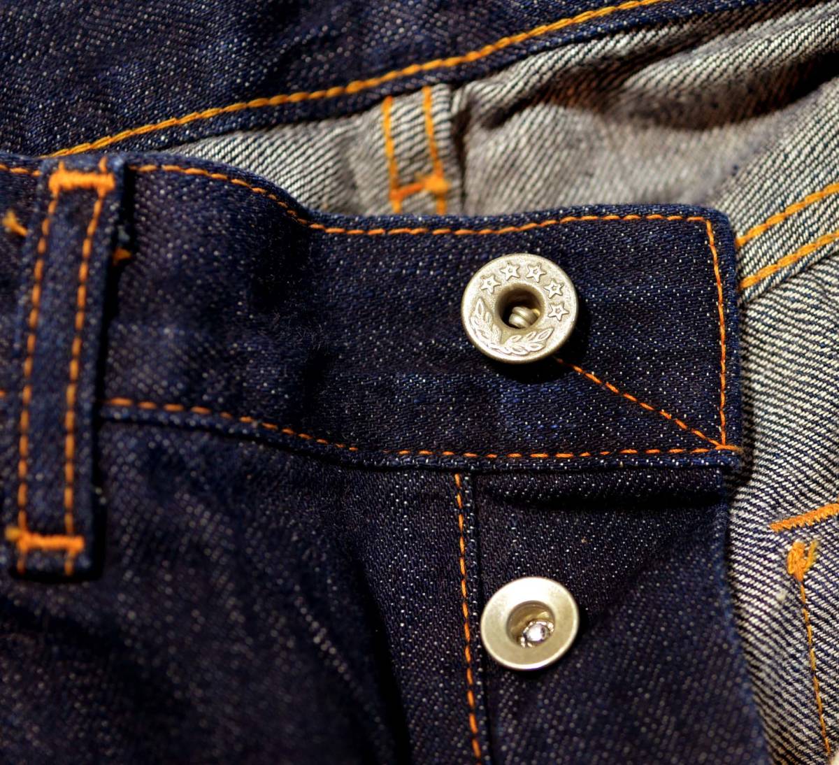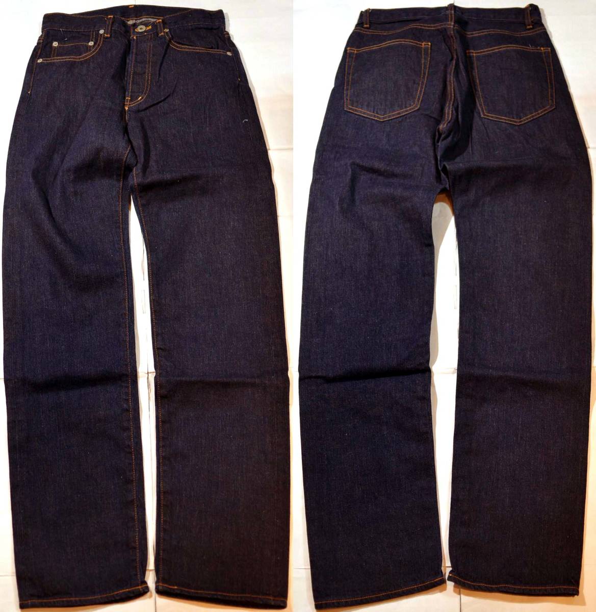 岡山児島産デニムです。サイズはW32で、実寸はW76cmL84cm、裾幅19cm、モモ幅27cm、全長111cmです。手作業の為多少の誤差はご容赦下さい。 防縮加工(ウォッシュ加工)ですので洗濯による縮みはありません。新品未使用、定価16800円(税抜)です。生地も縫製も全て国内の、純国産デニムです。生地は穿きやすい大戦仕様で少しライトオンス。縦落ちに拘って緩いテンションでザラ感を出しています。 1940年代のジーンズそのまま、トップボタンは月桂樹、第二以下はフラットヘッドのドーナツボタンを使用しています。裾はユニオンスペシャルによるチェーンステッチです。 サンプル品を購入したので、フラッシャー類はありません。 ノークレーム、ノーリターンでお願いします。