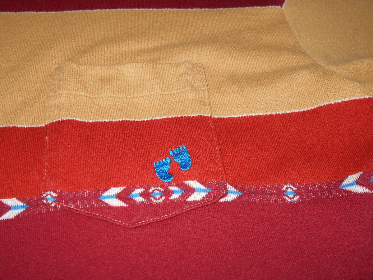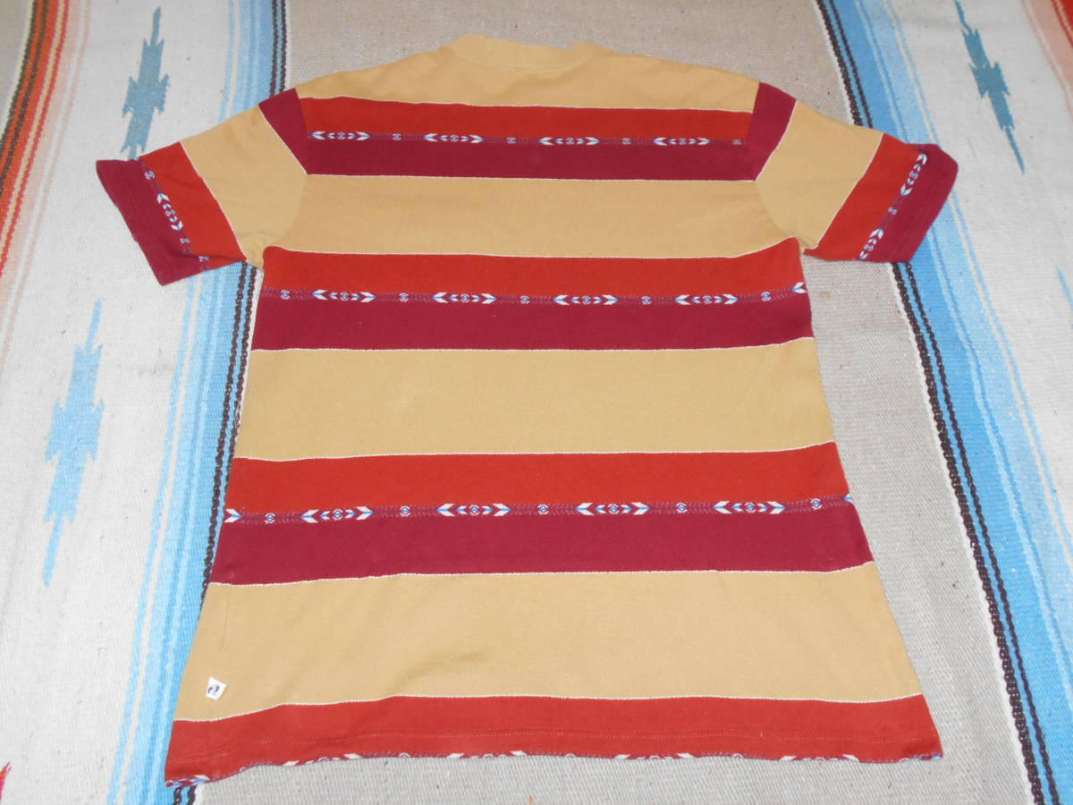チェストポケットのターコイズブルー 大型 HANG TEN フィートマーク刺繍デザイン、好配色マルチカラーの絶妙なボーダー柄