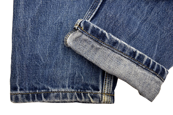 股上で合わせた、股部分の縫い合わせを基準にして、裾までの長さを計測しています。その際、縮みや、シワを考慮して、床より少し浮かせて、ピンと伸ばした状態で計測しています。