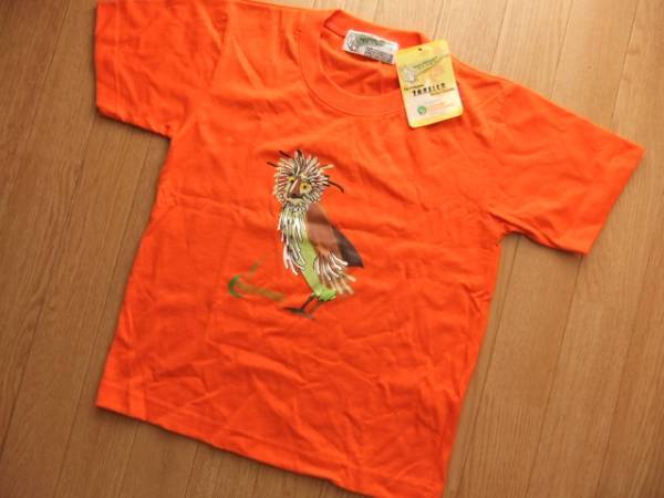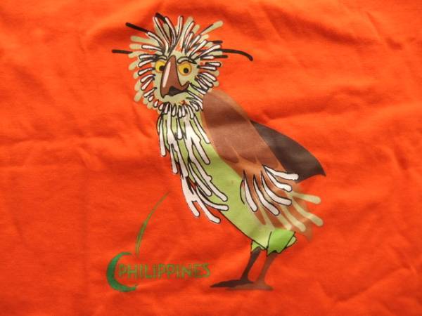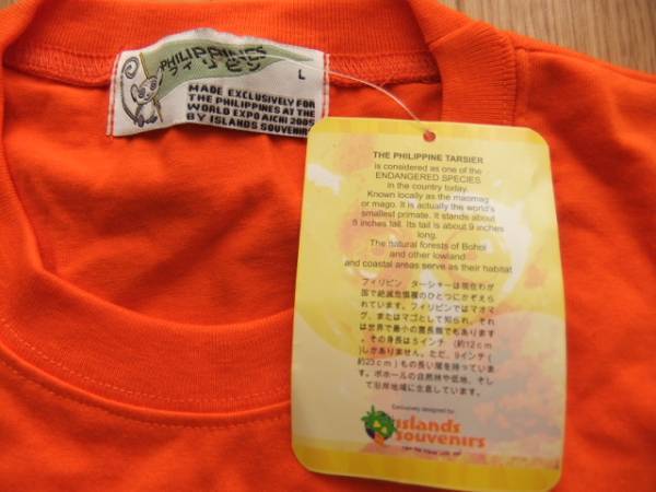 新品タグつきの、世界最小霊長類の絶滅危惧種のフィリピンターシャーのプリントを前面にあしらったオレンジ色Tシャツです。