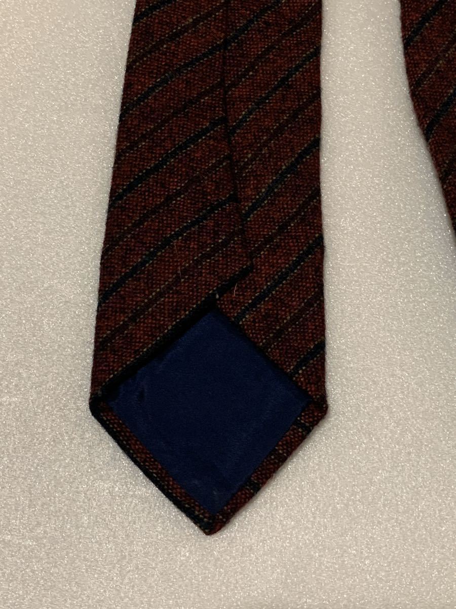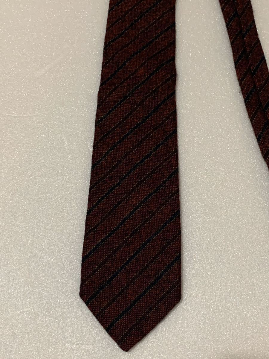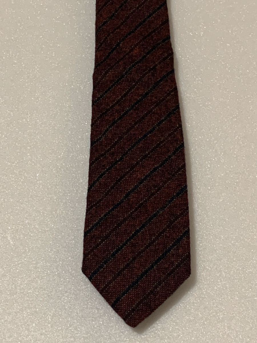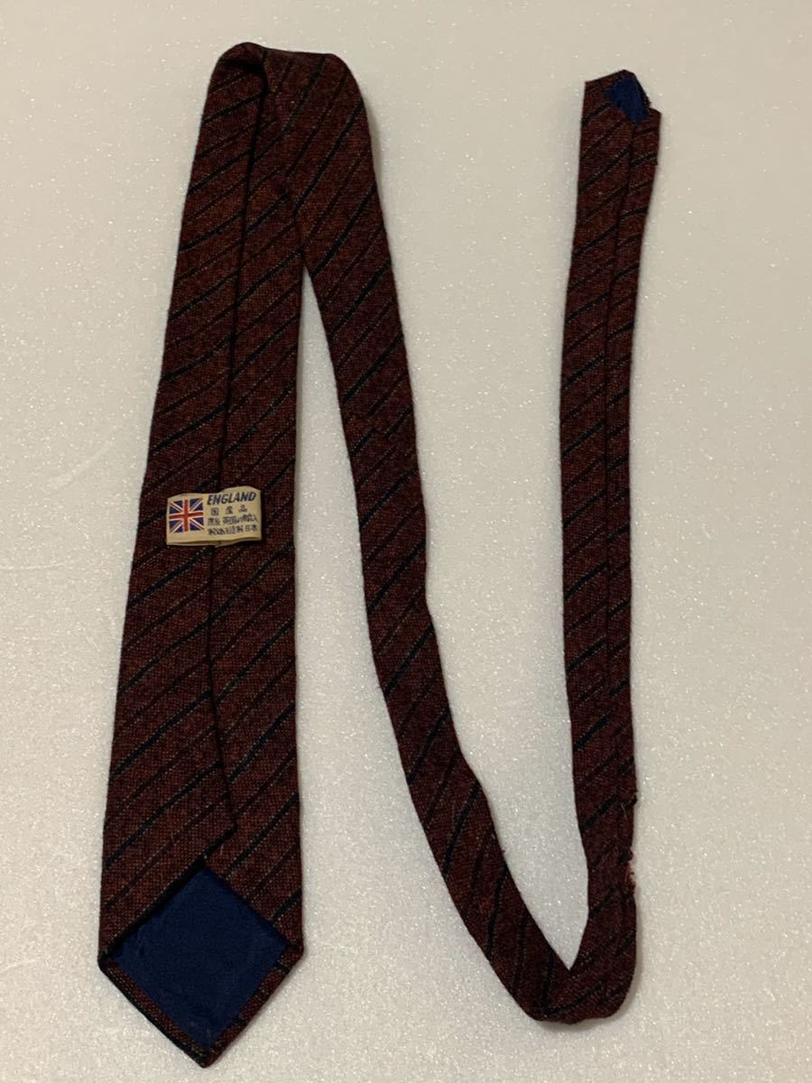 -NT02-【送料無料】ウール ENGLAND 原糸 日本製 ヴィンテージ ネクタイ レトロ 小豆色 紺 斜めストライプ 古着 。着用感あり。破れはありますが、結き部の為目立ちません。ビンテージとして楽しまれる方の落札をお願い致します。サイズや素材等でのクレームや返品はお受け出来ませんので、ご注意ください。日本で購入したビンテージ品です。