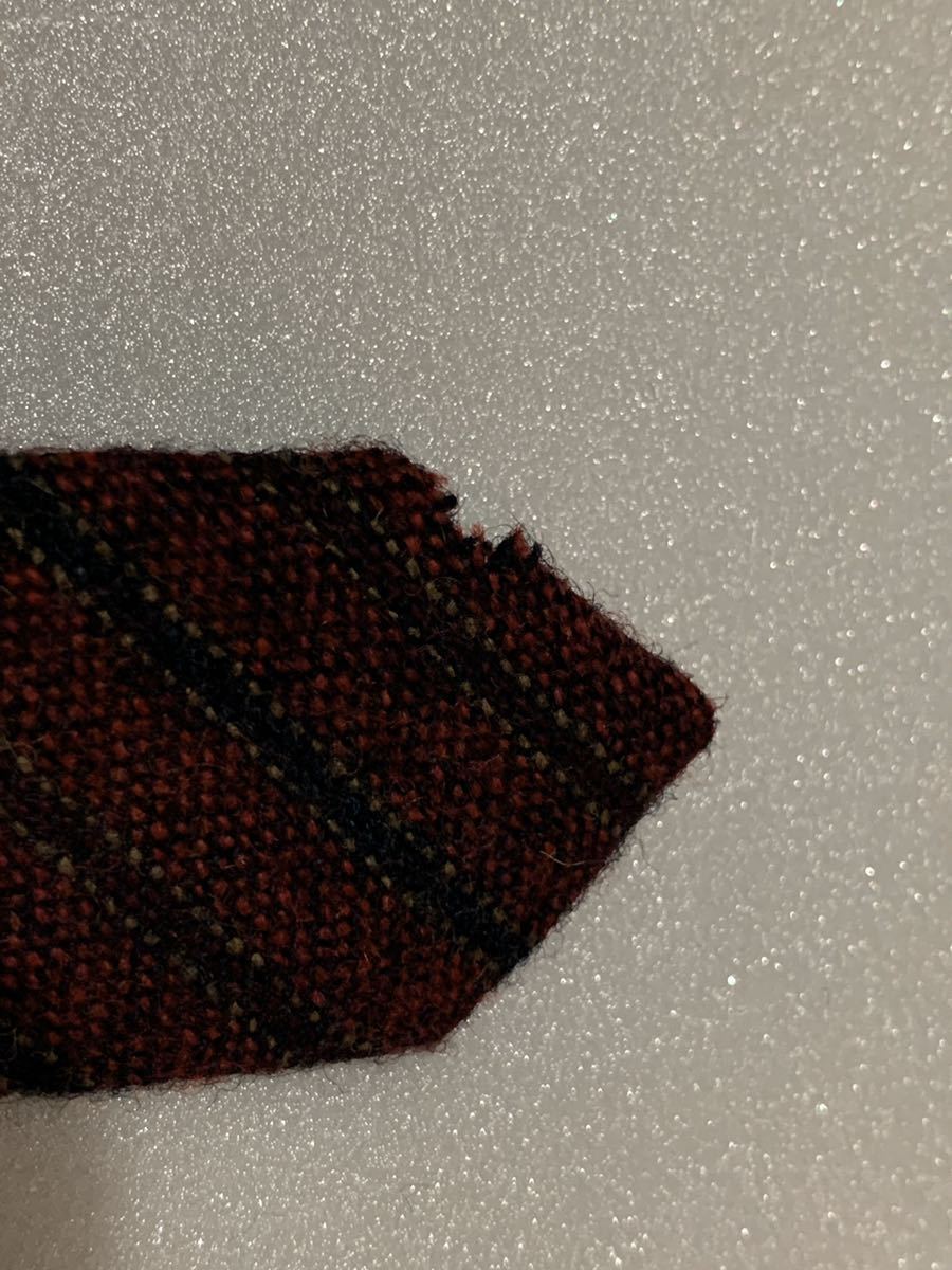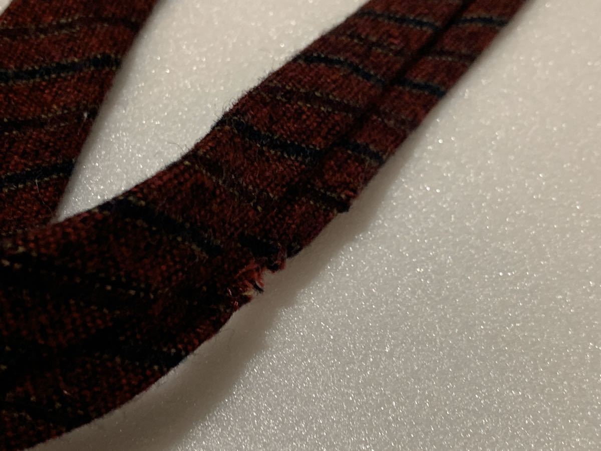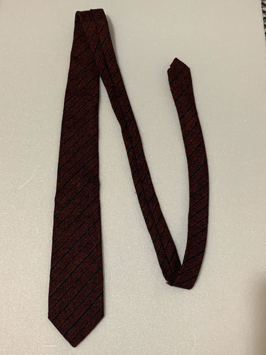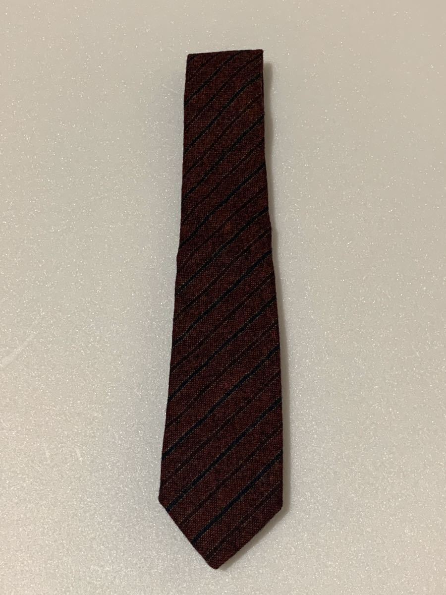 -NT02-【送料無料】ウール ENGLAND 原糸 日本製 ヴィンテージ ネクタイ レトロ 小豆色 紺 斜めストライプ 古着 。着用感あり。破れはありますが、結き部の為目立ちません。ビンテージとして楽しまれる方の落札をお願い致します。サイズや素材等でのクレームや返品はお受け出来ませんので、ご注意ください。日本で購入したビンテージ品です。