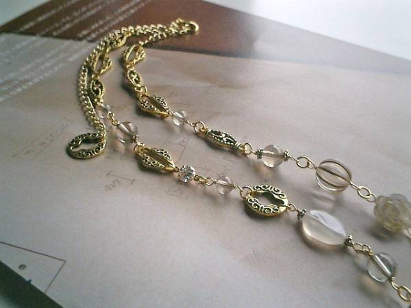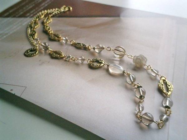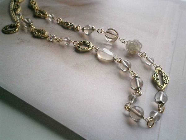 終わりのない夢・・シリーズです♪アジアへの旅・・神秘的な石を集めたネックレスです♪♪繊細な薄色のスモーキークォーツは6ミリ、8ミリの丸玉と14ミリ位の薔薇です♪18×13ミリ位のフラットオーバルのホワイトカルセドニーや5ミリ位のジルコニアやデザインビーズやデザインチェーンを合わせてアジアンチックにまとめました♪色をおさえてシックで華やかな表情です♪長さは全長74センチ位で調節自由です♪2連にされても素敵です♪同じデザインの長さ違いやお揃いのブレスレット、ピアスも出品しています♪長く着けていただけるデザインを考えて作りました♪ハンドメイドをご理解頂いてノークレーム、ノーリターンでお願いします