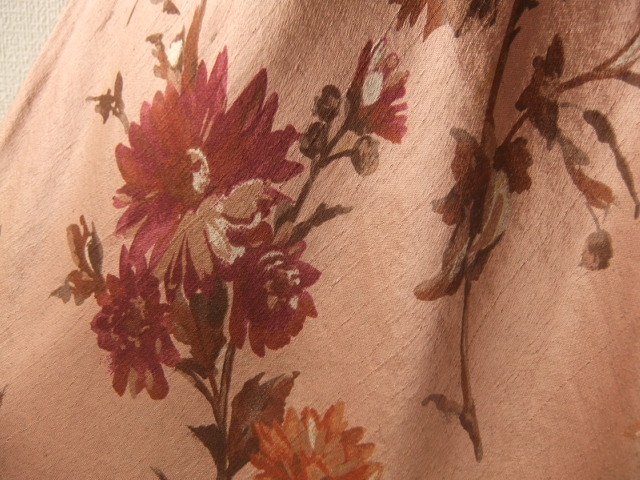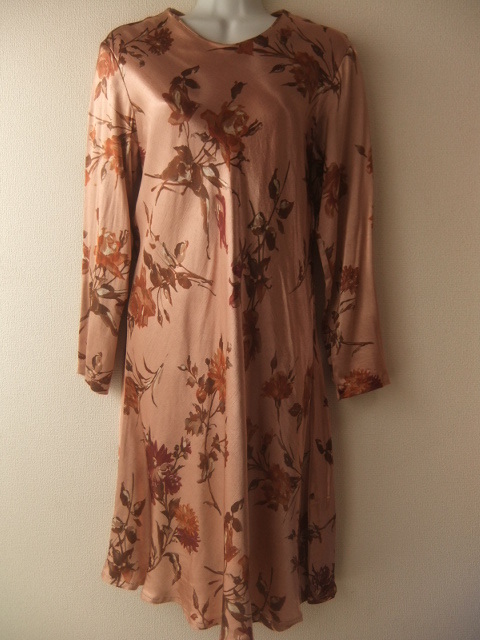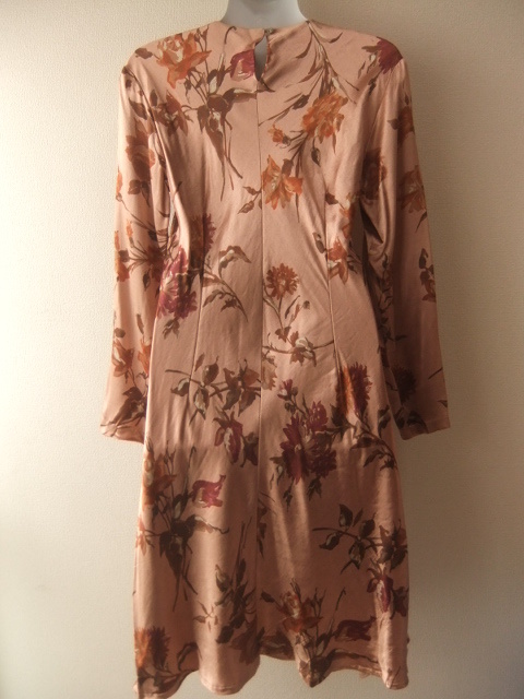 LAURA ASHLEY ローラアシュレイの、光沢のあるピンクベージュ地に落ち着いた花柄をあしらったワンピースです。