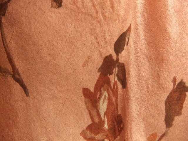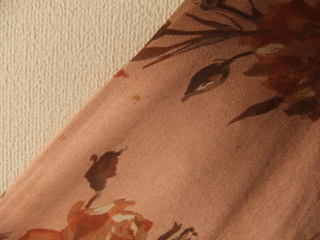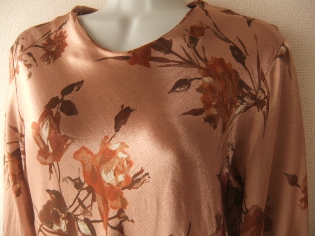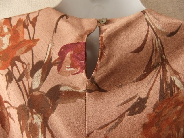 ローラアシュレイUK10★花柄プリント光沢のあるピンクベージュワンピース少々難あり