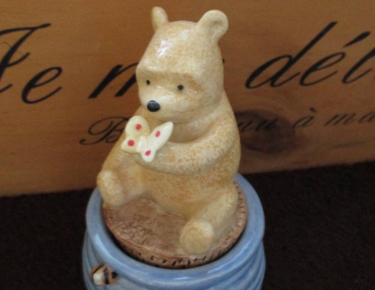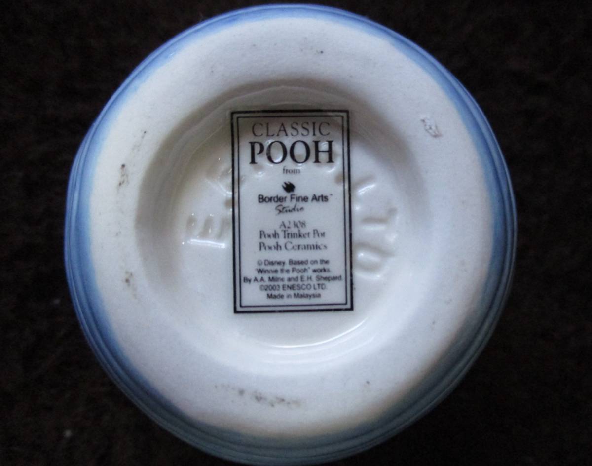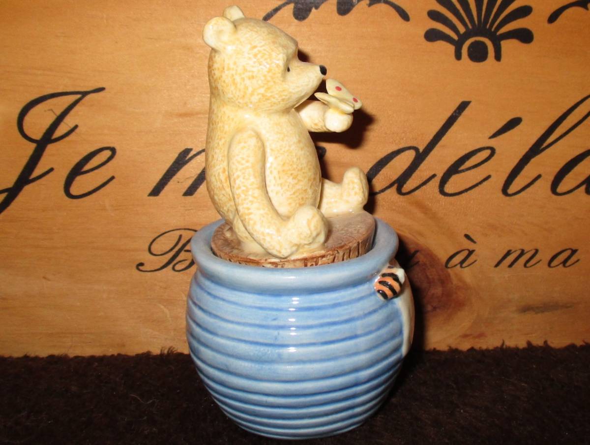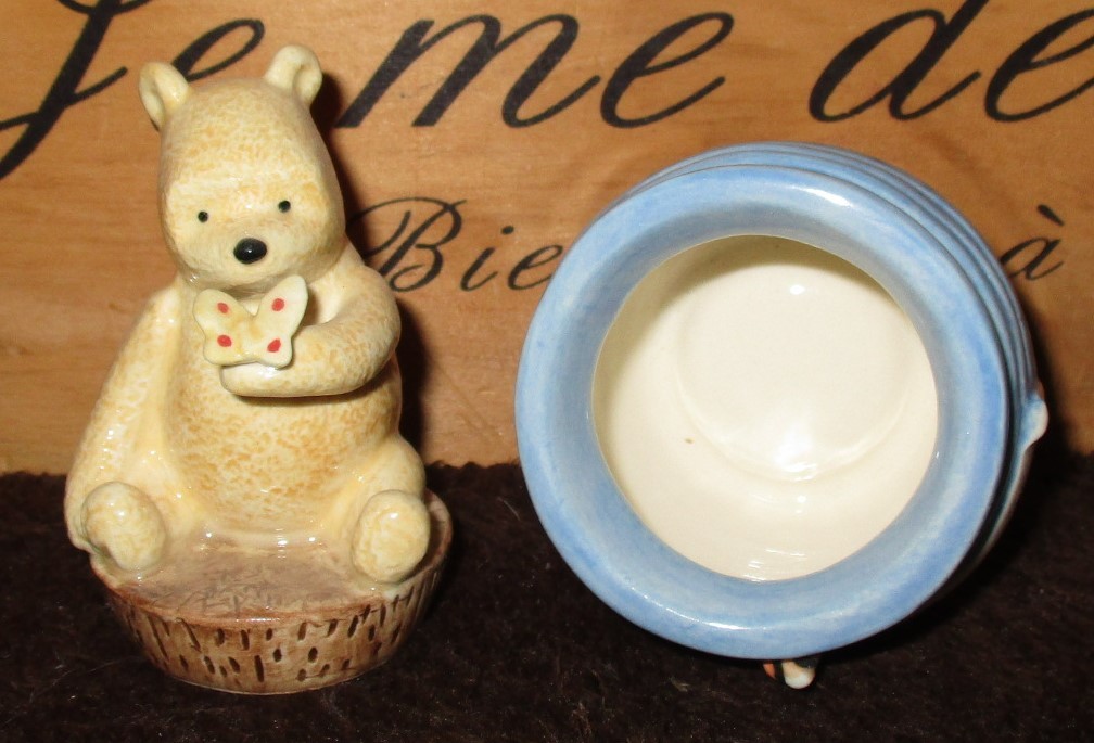 高さは約10センチ~11㎝です。数年前にネットショップで購入しました。使用はせずコレクションケースで飾っていました。ピアスとか金平糖とか入れるのでしょうか?詳しくわかりません。他にもクラシック・プー出品していますのでご覧ください。
