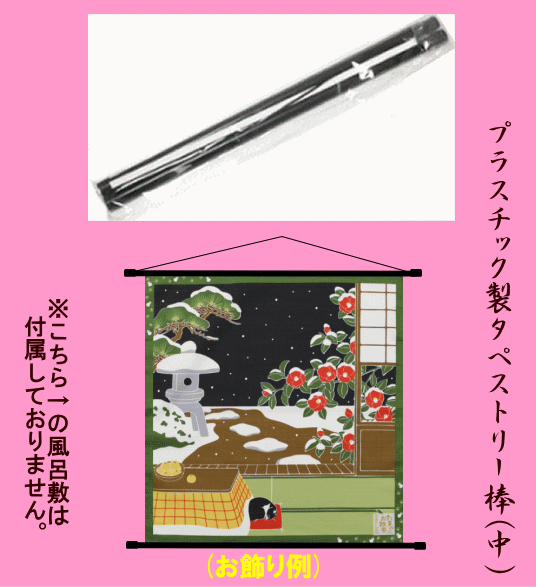 プラスチック製のタペストリー(掛け軸)棒<中サイズ>です。 手拭いや風呂敷をそのまま飾る事ができ、 一枚の柄絵をあます所なく味わえます。 中でも50cm四方の風呂敷を飾って頂くには ベストなサイズのタペストリー棒です。 来客の際や場と空気を造りだすインテリアとして是非お勧めです。 四季折々の手拭いや風呂敷を飾ってみてはいかがでしょうか? 風呂敷などの1枚の布が素敵なアートに大変身!! 是非お試し下さい。 ★サイズ★ 長さ約56cm×直径約1.7cm ★素材★ プラスチック製 ★付属品★ 両端の留め具・紐付き プラスチック製(小サイズ)及び天然木にて作られた 縦柄用(小・中サイズ)&横柄用のタペストリー棒(大サイズ)も 販売中です。 |